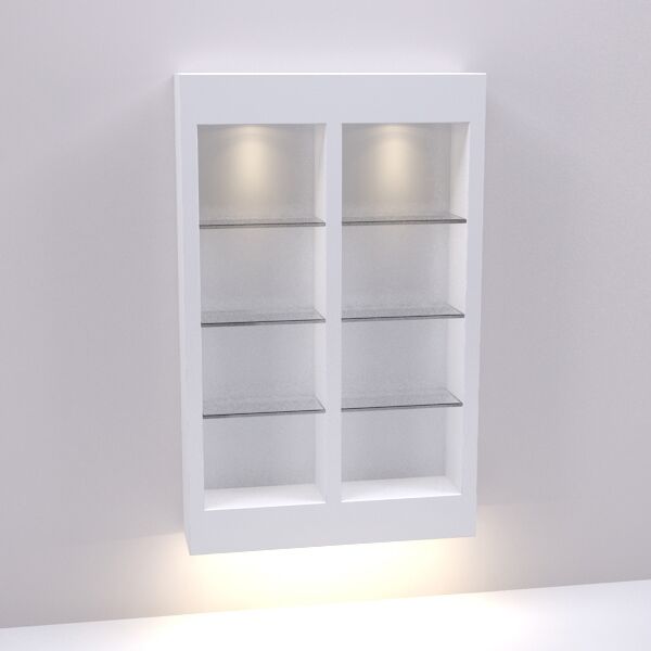 This sleek modern wall apparel display will highlight your handbags, shoes, hats and more. Floating display has integrated lighting at the top and at the bottom. Includes adjustable glass shelves. Choose your single or double column. Duplex Outlets to Power Integrated LED lighting. 120v. Custom laminate colors and sizes available.