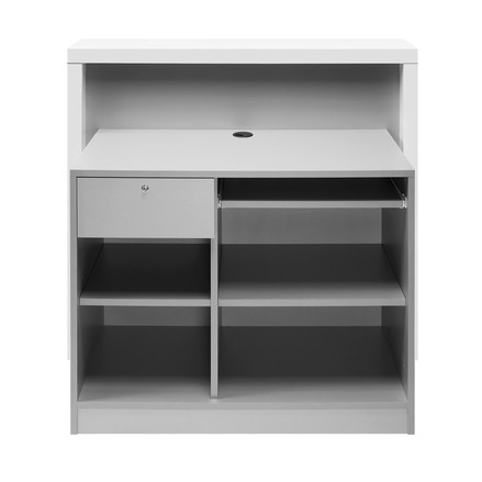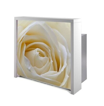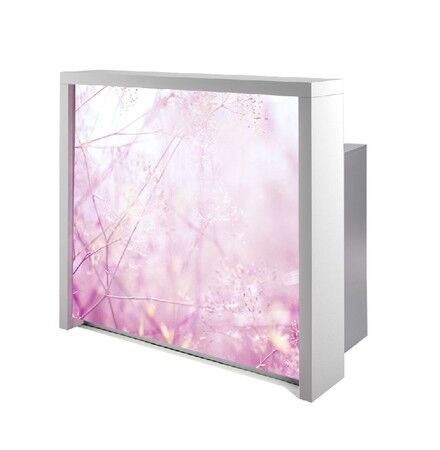 Reception desk with silver cabinet, matte white frame, and a replaceable graphic of your choice with backlighting. Made in and shipped from Italy – Please allow 8 to 10 weeks for delivery.