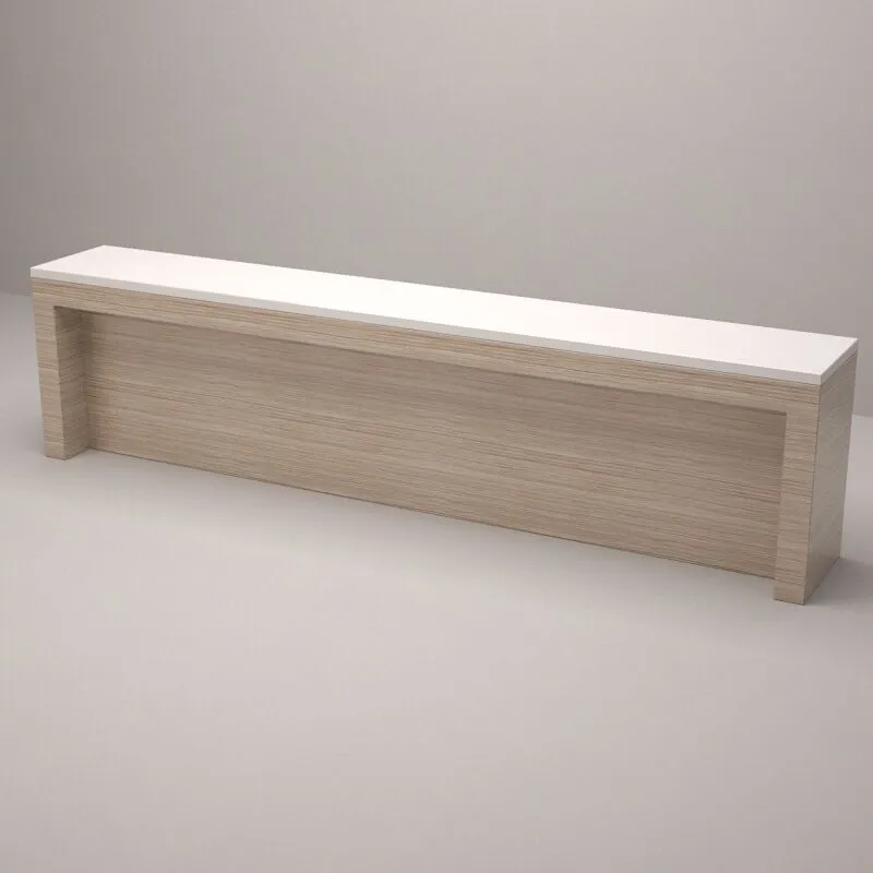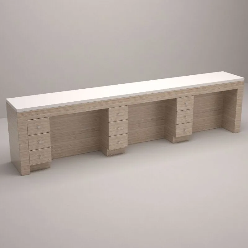 The Aiden customize-able bar collection has a clean modern look that is features a 1″ thick white solid surface top that contrasts with the horizontal linear grain of the laminate for an approachable, simplistic statement piece that functions to meet the most stringent nail environments. The bar is priced and shown as a 3-person bar with 3 technician storage cabinets in the back, however the bar length can be made up to 252″ long for 6 persons with technician storage cabinets sold separately so that you can truly customize the bar to your specific requirements.