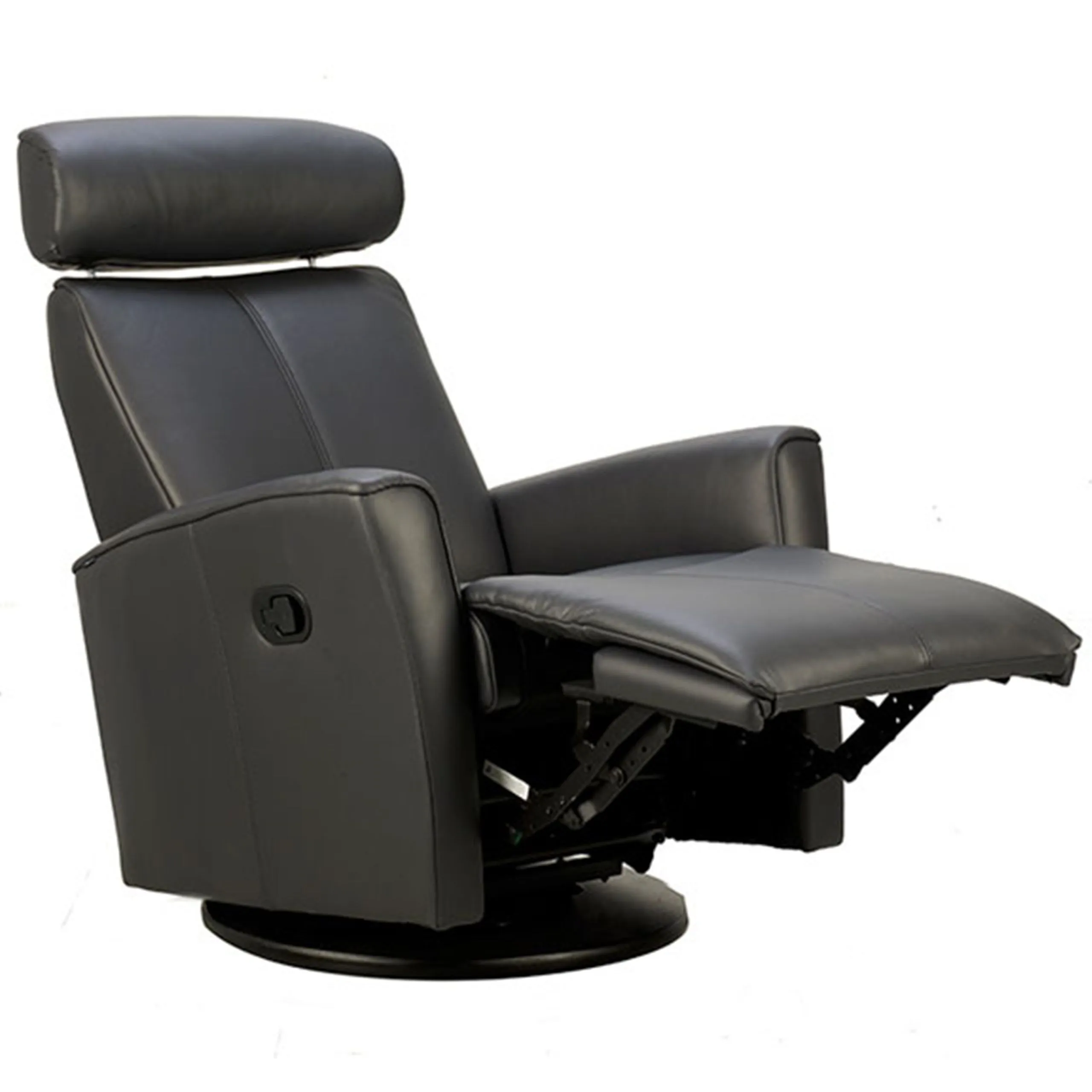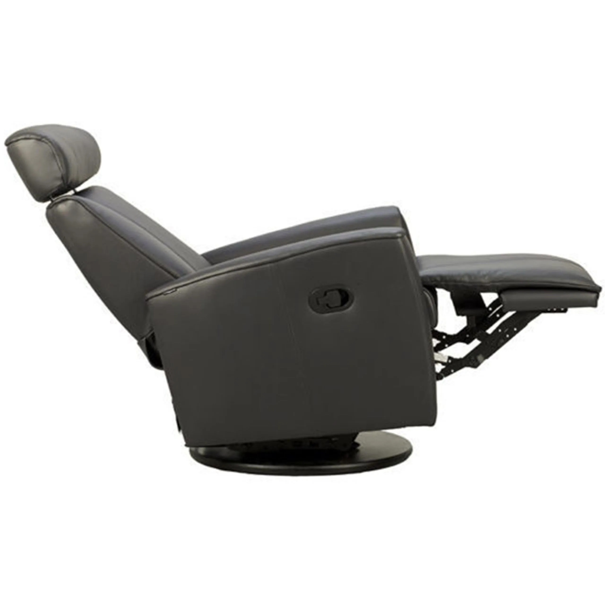 Our Alex chair with a height adjustable headrest and manual release headrest angle, makes the seating experience ergonomic and gives your lower back correct support. Alex is a swivel/glider/rocker recliner available in large only; manual  and motorized.  Motorized version available as an upgrade.  Available in Anthracite with a standard Black Base.