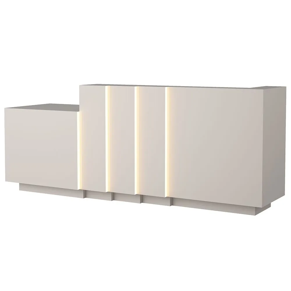 Auberge Reception Desk is the luxury hospitality reception desk, where elegance meets functionality with its modern stepped detail and integrated lighting. Size:  108"w x 24"d x 44" High (ADA & Work Counter 34").