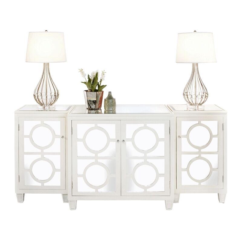 Beautifully crafted three piece white lacquer buffet with a beveled mirror insets adds plenty of storage and artful elegance to any room. Color: White Lacquer & Mirror Dimensions: 79.25″W X 35.5″H X 22″D