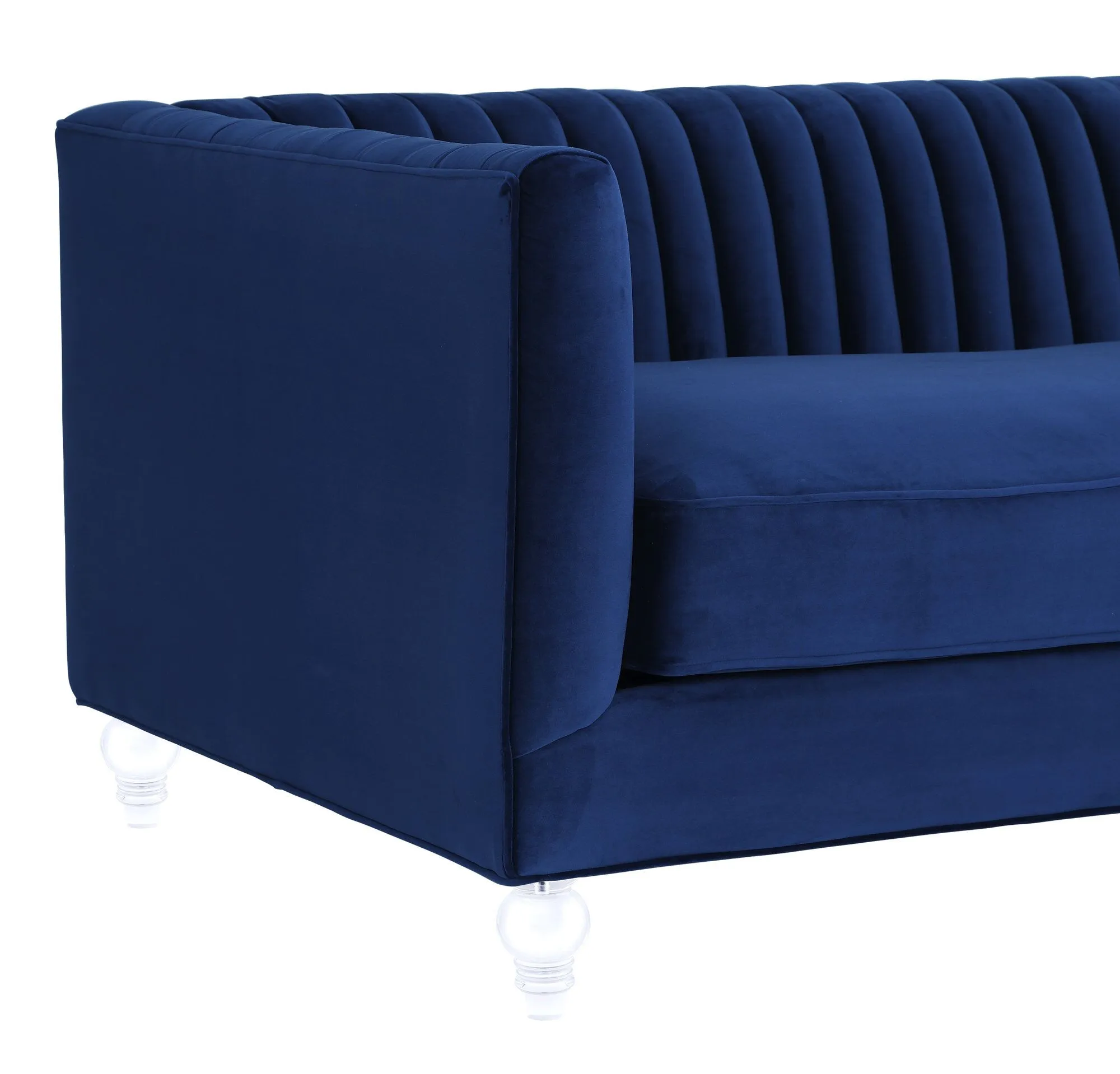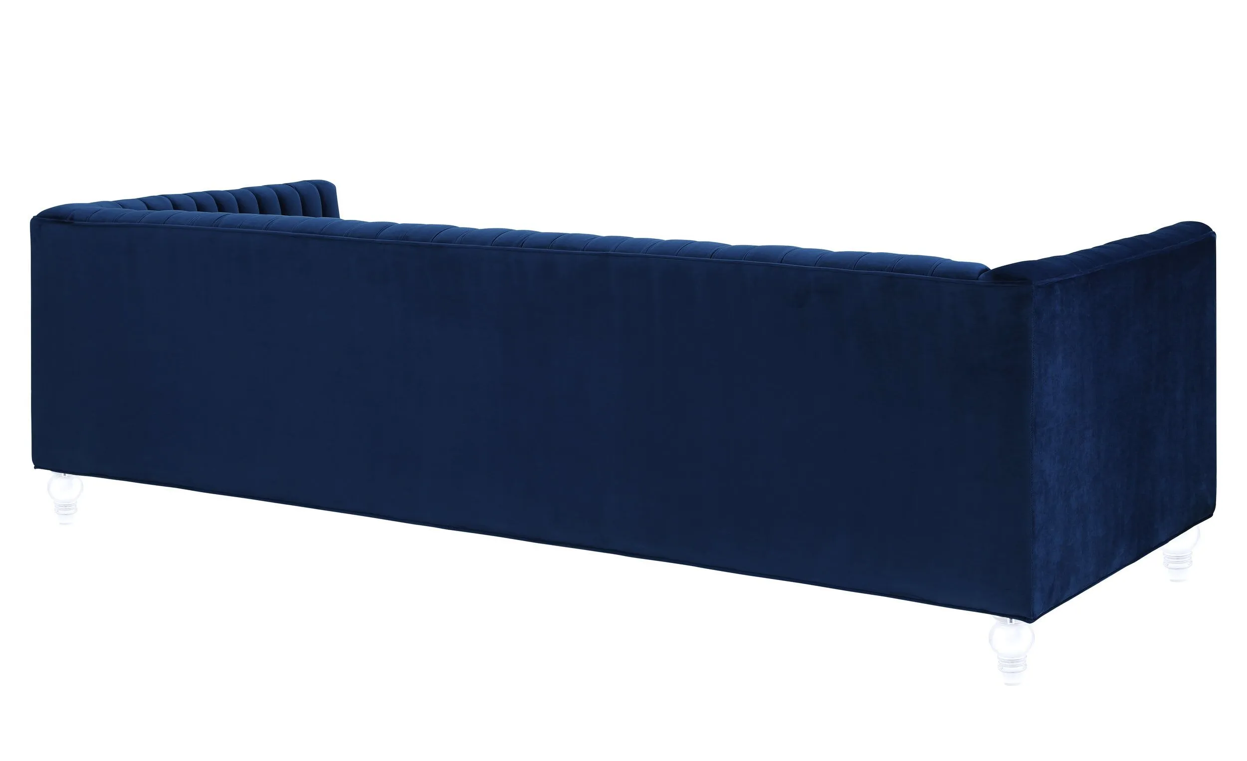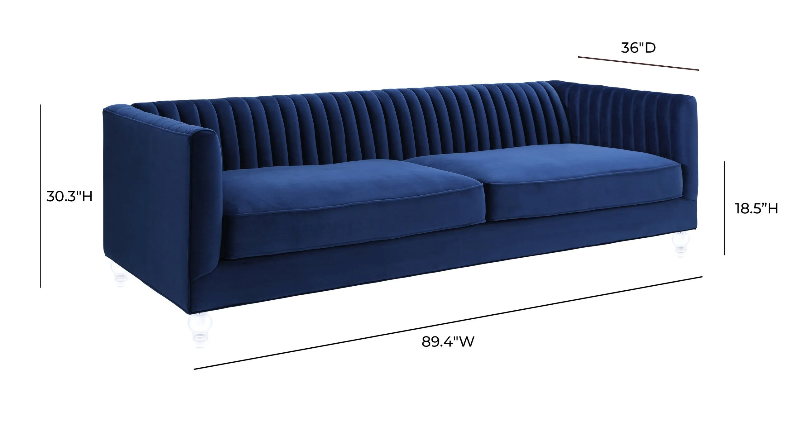 The Aviator sofa brings contemporary style and comfort to your living space with its distinctive design features. This handmade piece showcases expert craftsmanship with a kiln-dried solid wood frame and eye-catching Lucite legs that add a modern touch. The comfortable velvet upholstery features carefully executed pleats and a unique striped back cushion, while removable high-density foam seat cushions provide lasting support. Measuring 89.4 inches wide with a generous 26.8-inch seat depth, this low-back, deep-seated sofa offers plenty of room to relax. The blue velvet finish adds rich color and texture to any room. Built by skilled furniture craftsmen, it supports up to 800 pounds and requires only minor assembly. The 80.3-inch seat width accommodates multiple people comfortably, making it ideal for entertaining or family gatherings. Fabric swatches are available to help you coordinate with your existing décor.