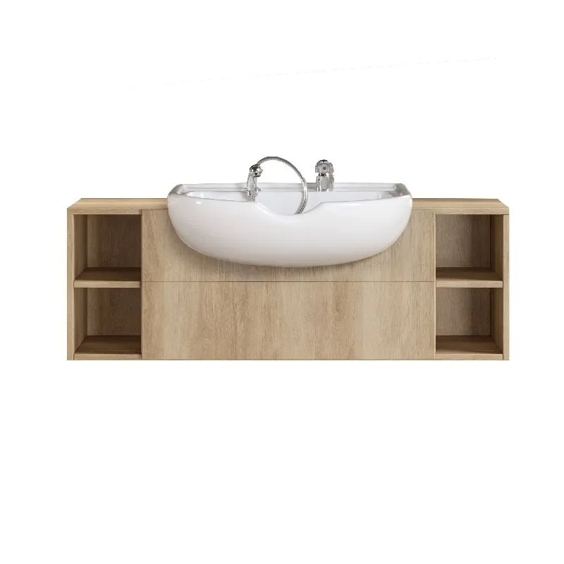 Central cabinet with white sink basin & faucet. Includes 120cm cabinet with open cube display.