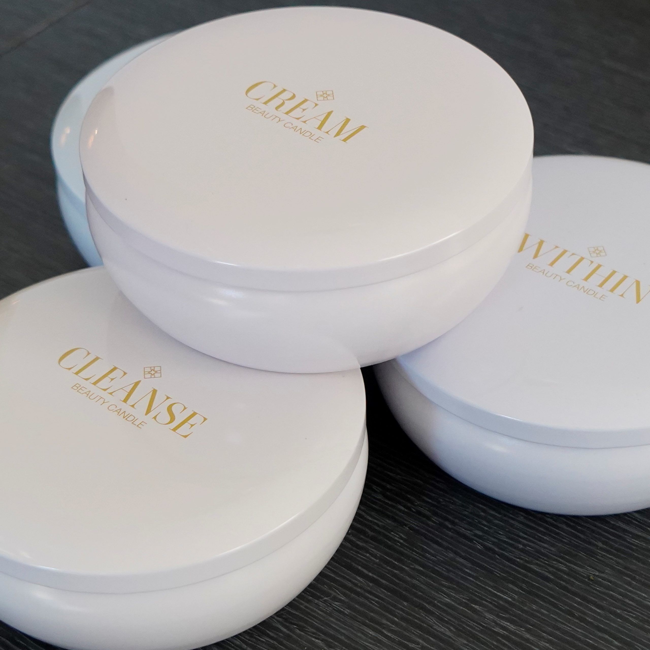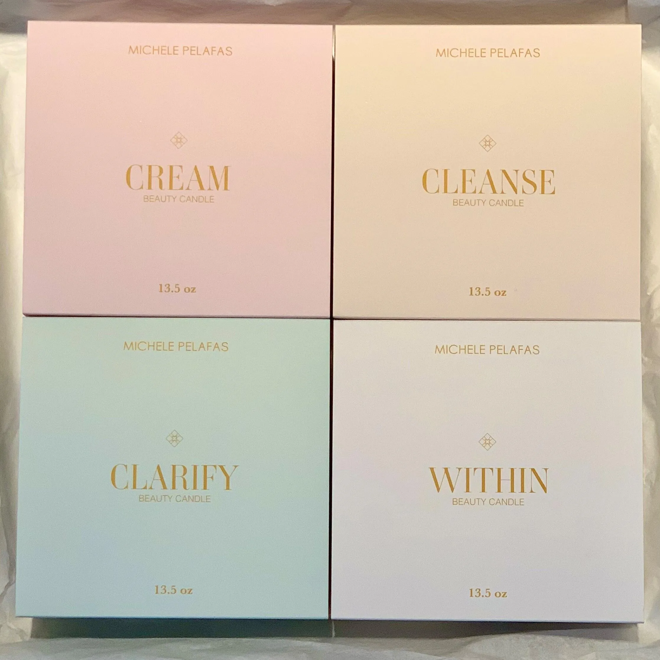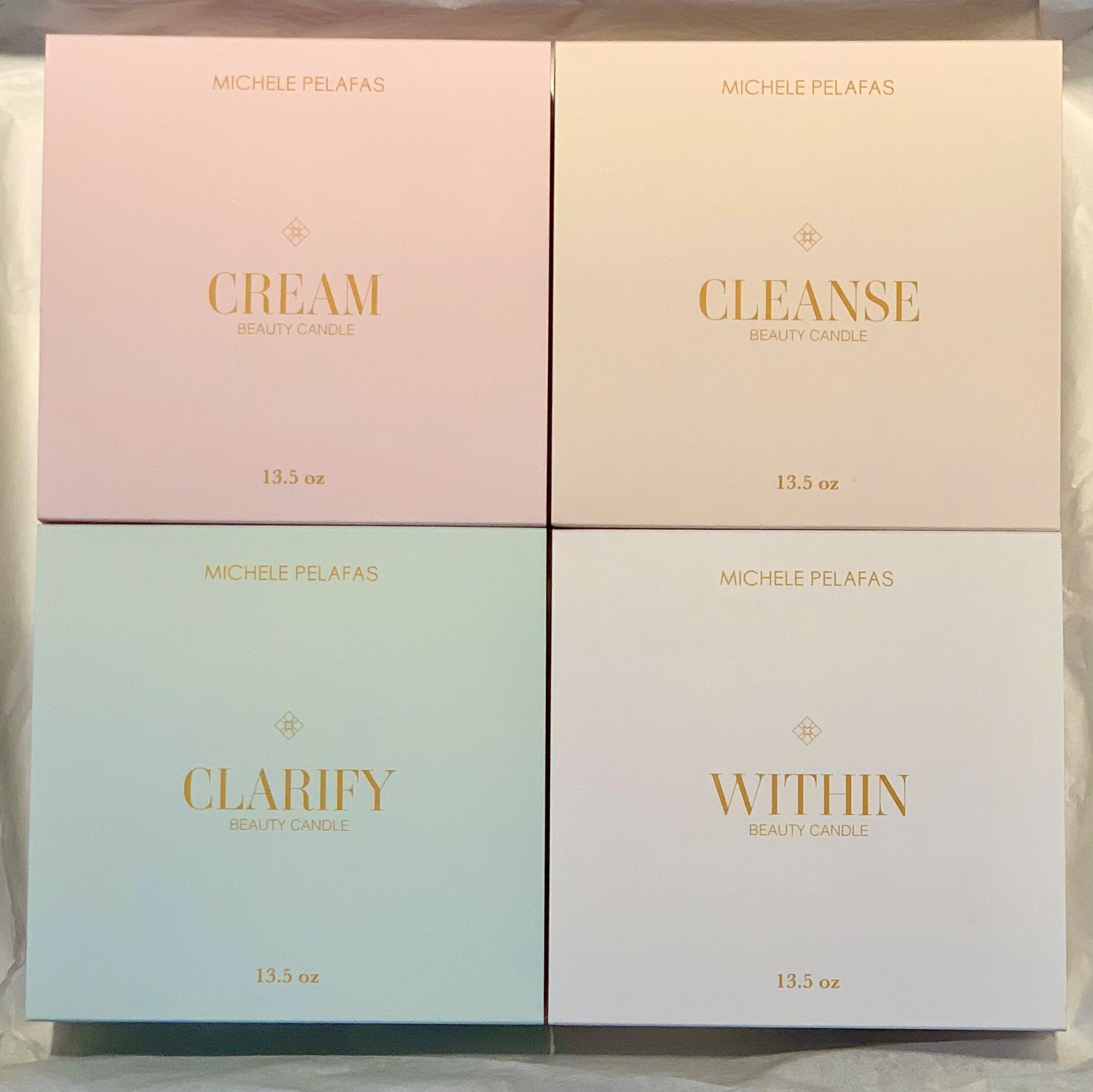 Our Total Experience Beauty Candle Set includes all 4 of our Beauty Candle originals: Cream, Cleanse, Clarify & Within. Each candle is a soy-based 3-wick candle, 13.5 oz each. 100% all natural cotton wick without coating. Includes: