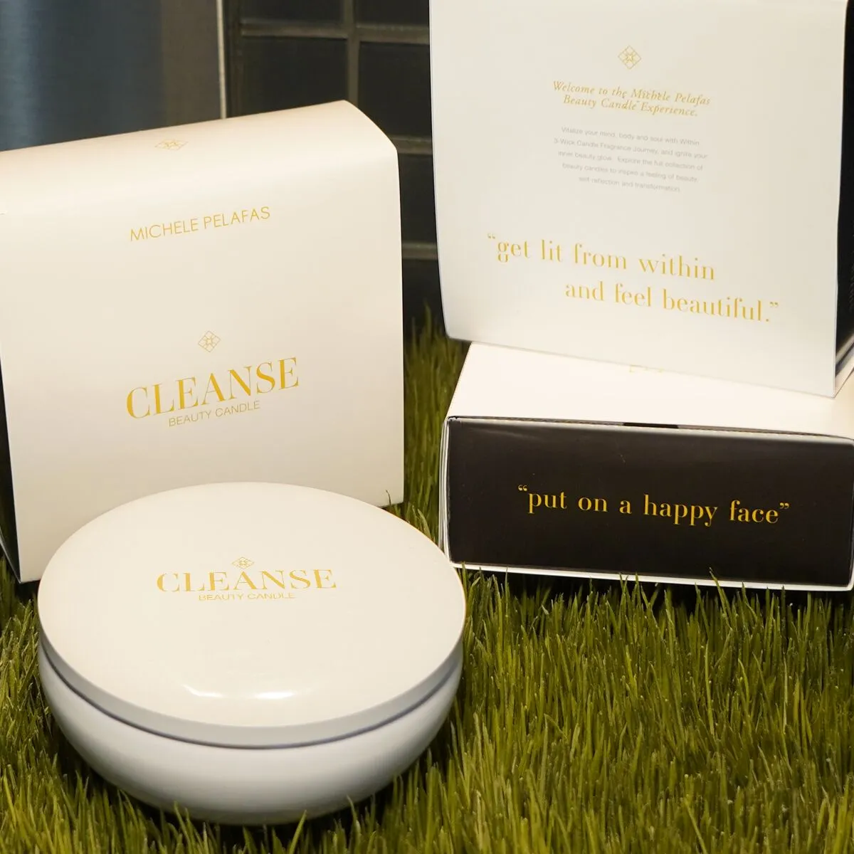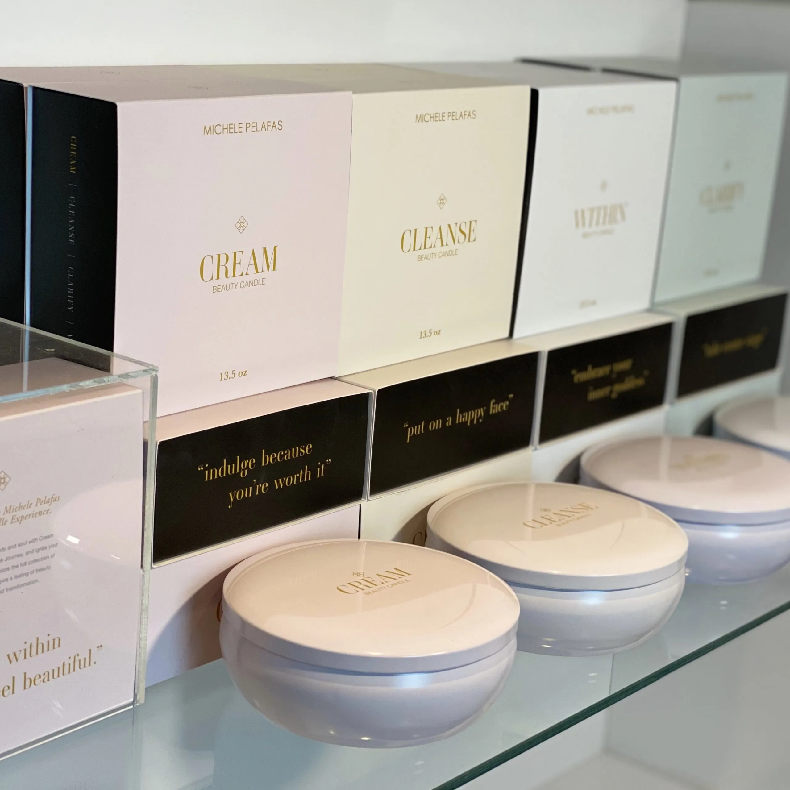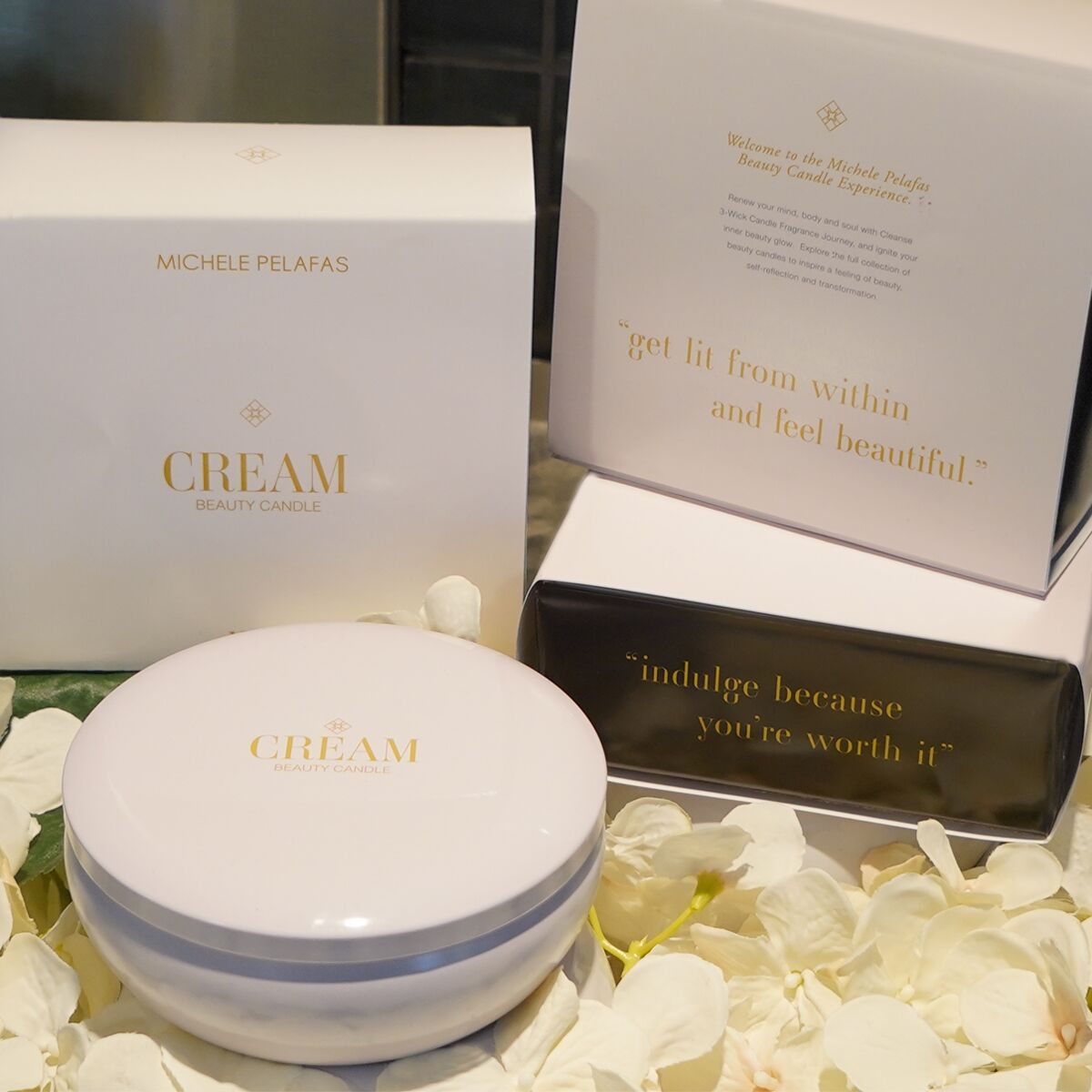 Our Total Experience Beauty Candle Set includes all 4 of our Beauty Candle originals: Cream, Cleanse, Clarify & Within. Each candle is a soy-based 3-wick candle, 13.5 oz each. 100% all natural cotton wick without coating. Includes: