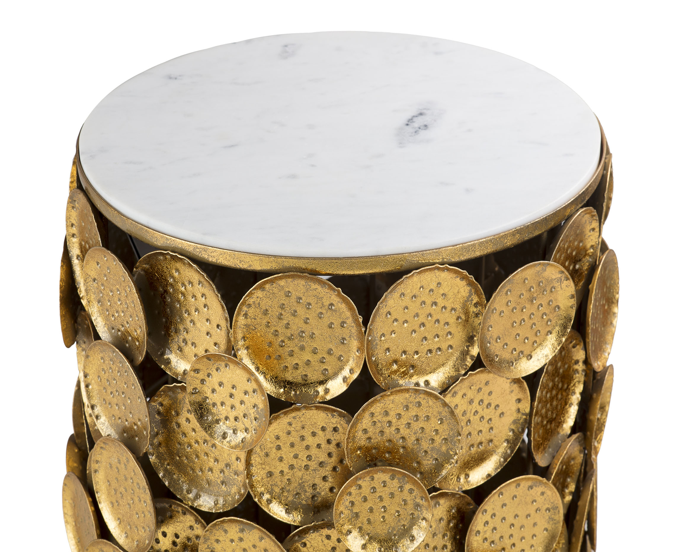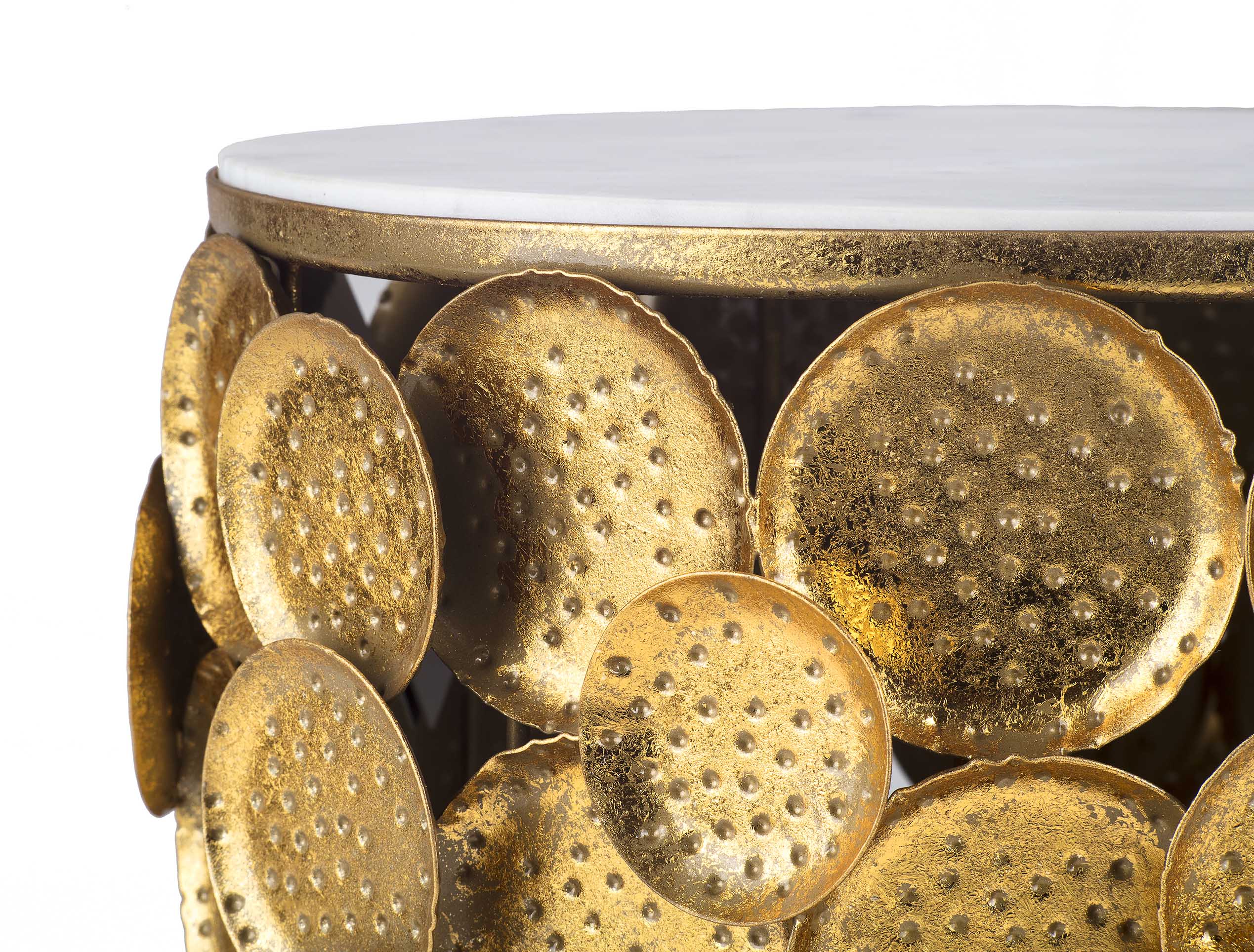 The Brie side table is a true work of art. Its marble top perched upon a base of dozens of hand hammered discs make this unique table a stunning enhancement to any room.