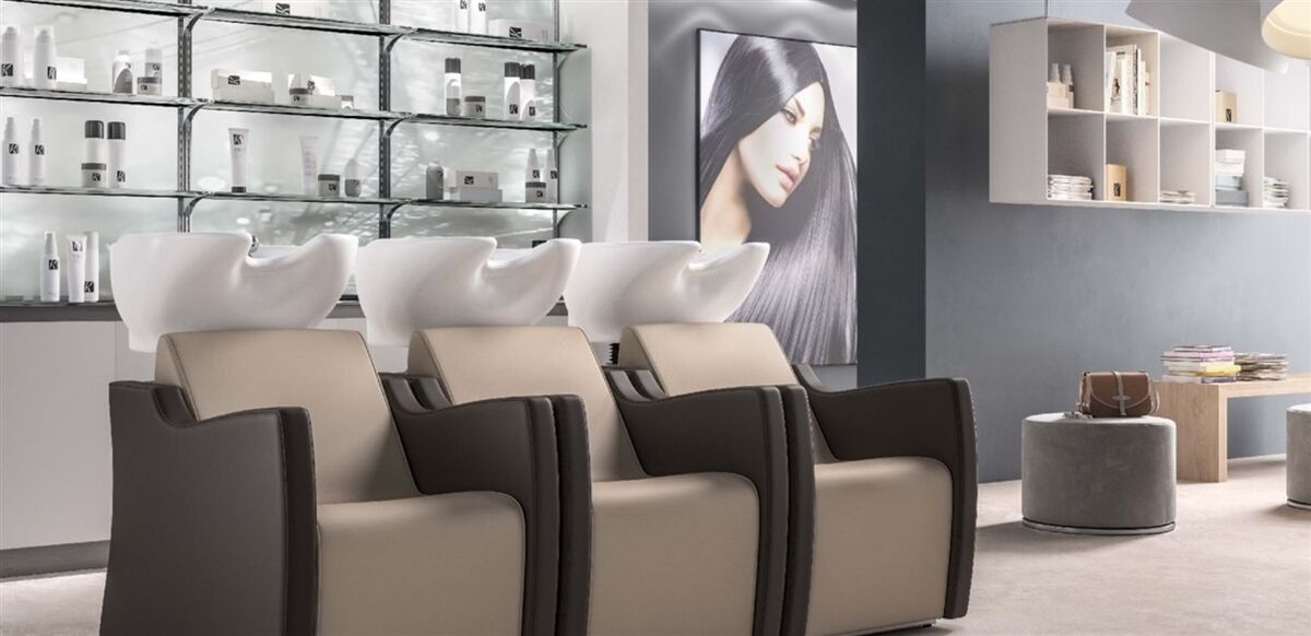 This high style base-model backwash unit with pivoting sink basin and chair combines high comfort and style. Quality performance is at the height of this shampoo unit with a steel inside structure and molded polyurethane foam padding for the chair and a heavy-duty steel structure to support the generously sized porcelain sink with chrome fittings at the workstation. Rear cover of ABS acrylic. Made and ships from Italy, please allow 10 weeks for delivery. Includes your choice of vinyl upholstery, white basin with storage.