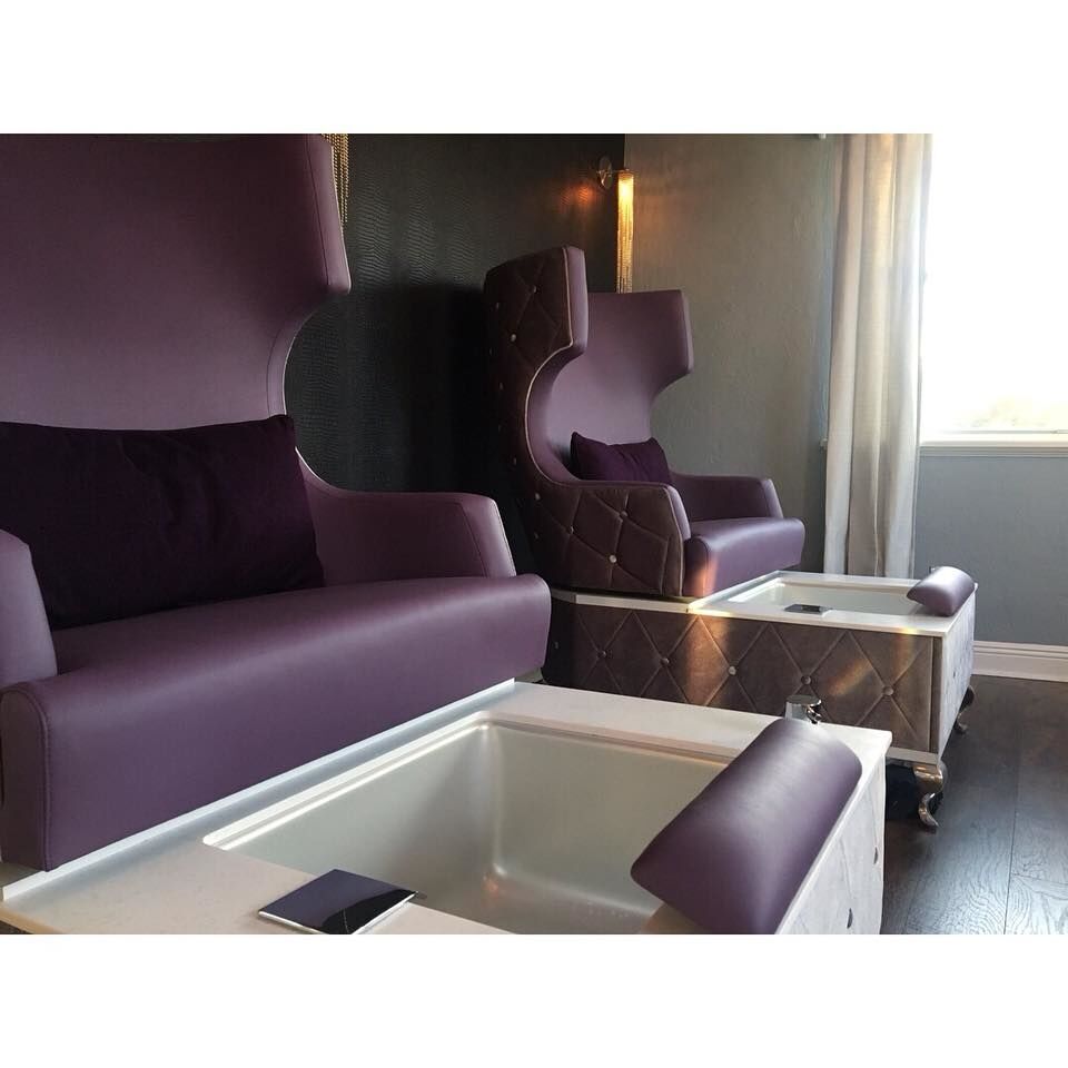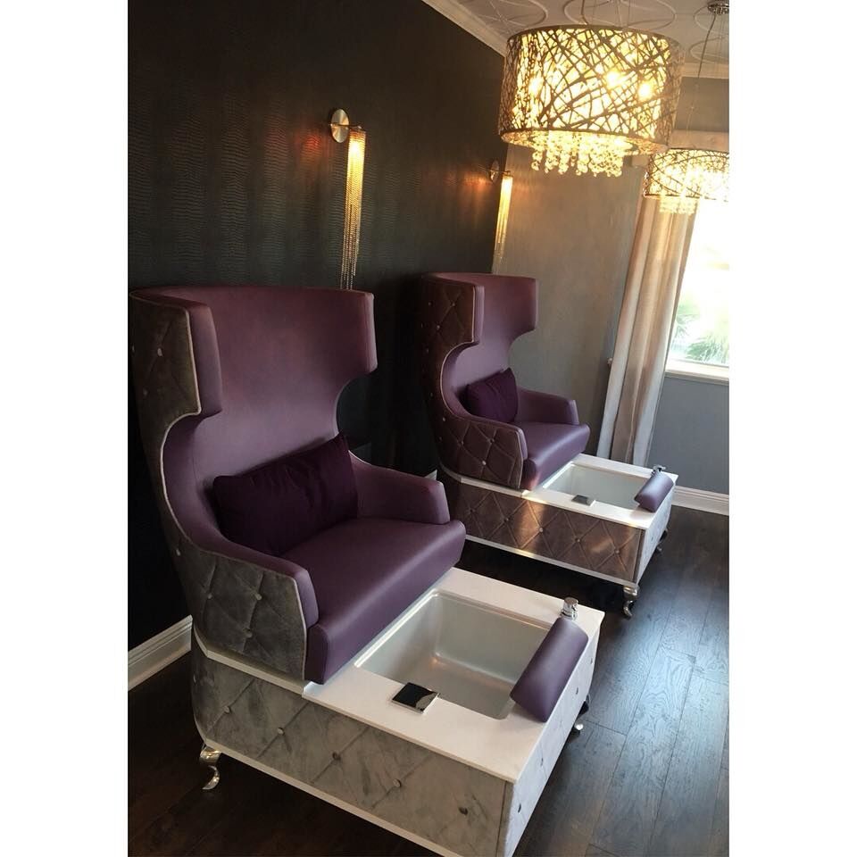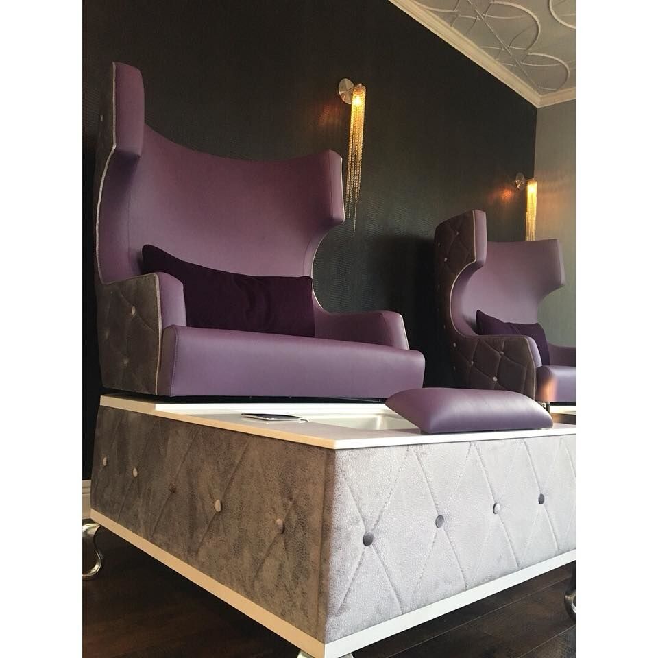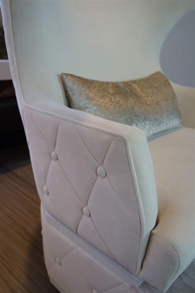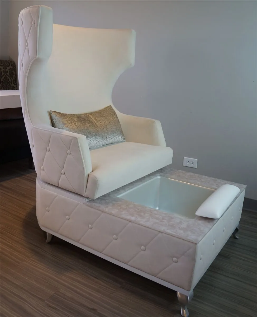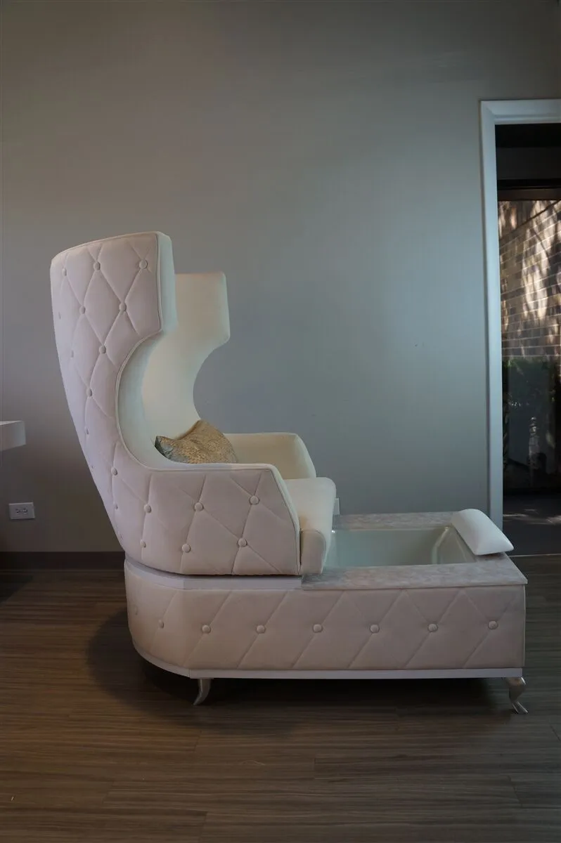 Fashionable. Distinct. Simply over the top. The plush and posh Carrie Swivel Pedicure Chair & Foot Spa combines fine furniture, modern comfort and technology giving and entirely new meaning to the word “pamper”. The sweeping soft curves, tall back and tufted detail make this chair extra-ordinary for any salon or spa environment. Guests will receive a luxurious and relaxing hydrotherapy foot bath while nestled within the generously sized seating with its sculpted wing-back that offers guest privacy and sound absorption. The classic shape will enhance the architectural quality of any room and is available in different color palettes and fabric patterns. Carrie makes a gorgeous and dramatic design statement bringing with it, quality, style and innovation. Designed by Michele Pelafas, Inc. and lovingly made in the USA.