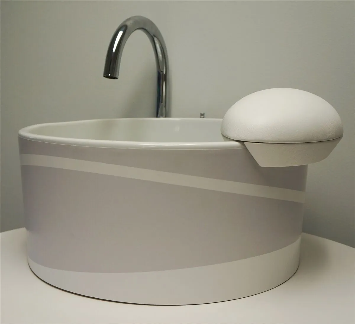 Our Chi Pedicure Sink from the Mode Motif Collection is now available in a sweeping curve-a-linear motif pattern for a functional yet statement-making pedicure sink to fit your style and interior with its stunning base color in white and colored motif pattern (shown in Charcoal). The properties of porcelain make this an ideal basin for pedicures. The non-porous sealed surface prevents bacteria from penetrating so your sink is sanitary. It is easy to clean and low maintenance with a smooth touchable surface and flat bottom so that it is comfortable for the feet. Our pedicure sinks are hand-made and sustainable green product made of recycled and all natural materials with a coating that has no VOC’s so the bowl is toxin-free. Includes a drain hole. Drain, faucet and footrest sold separately. Made in the USA and made to last a lifetime. Select your motif color.