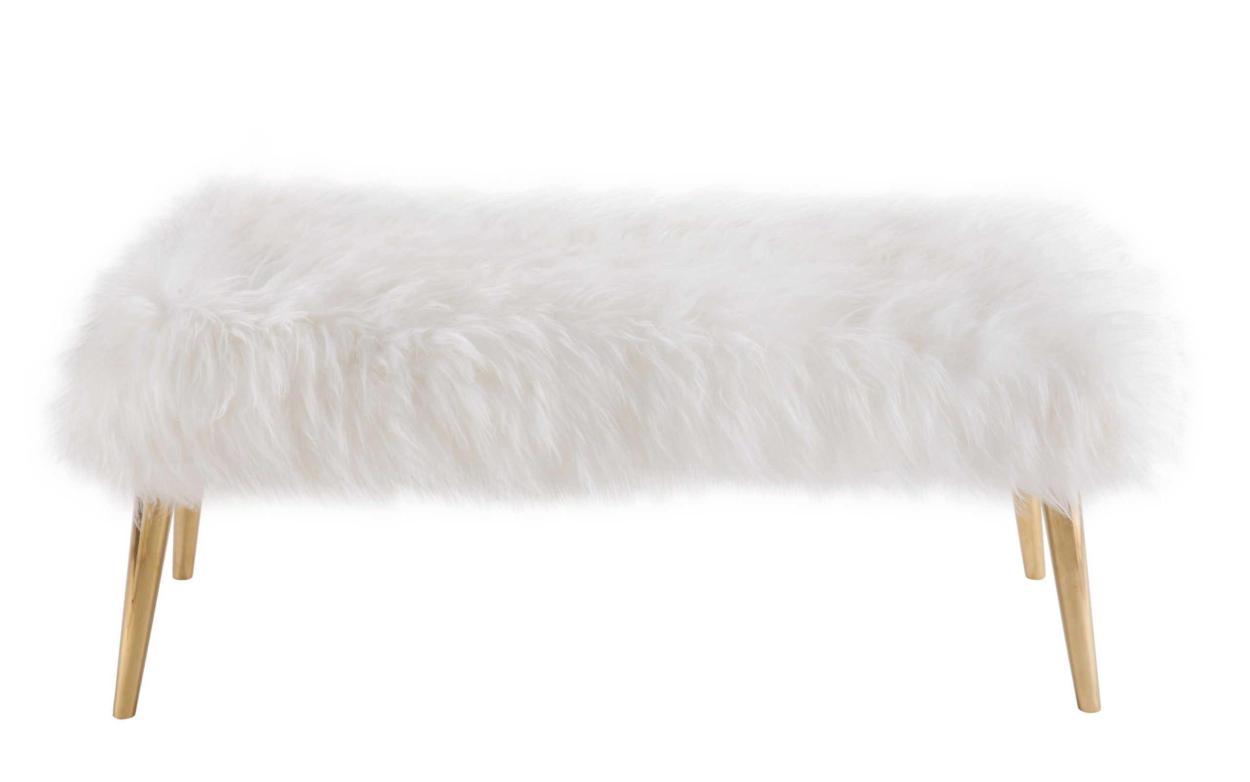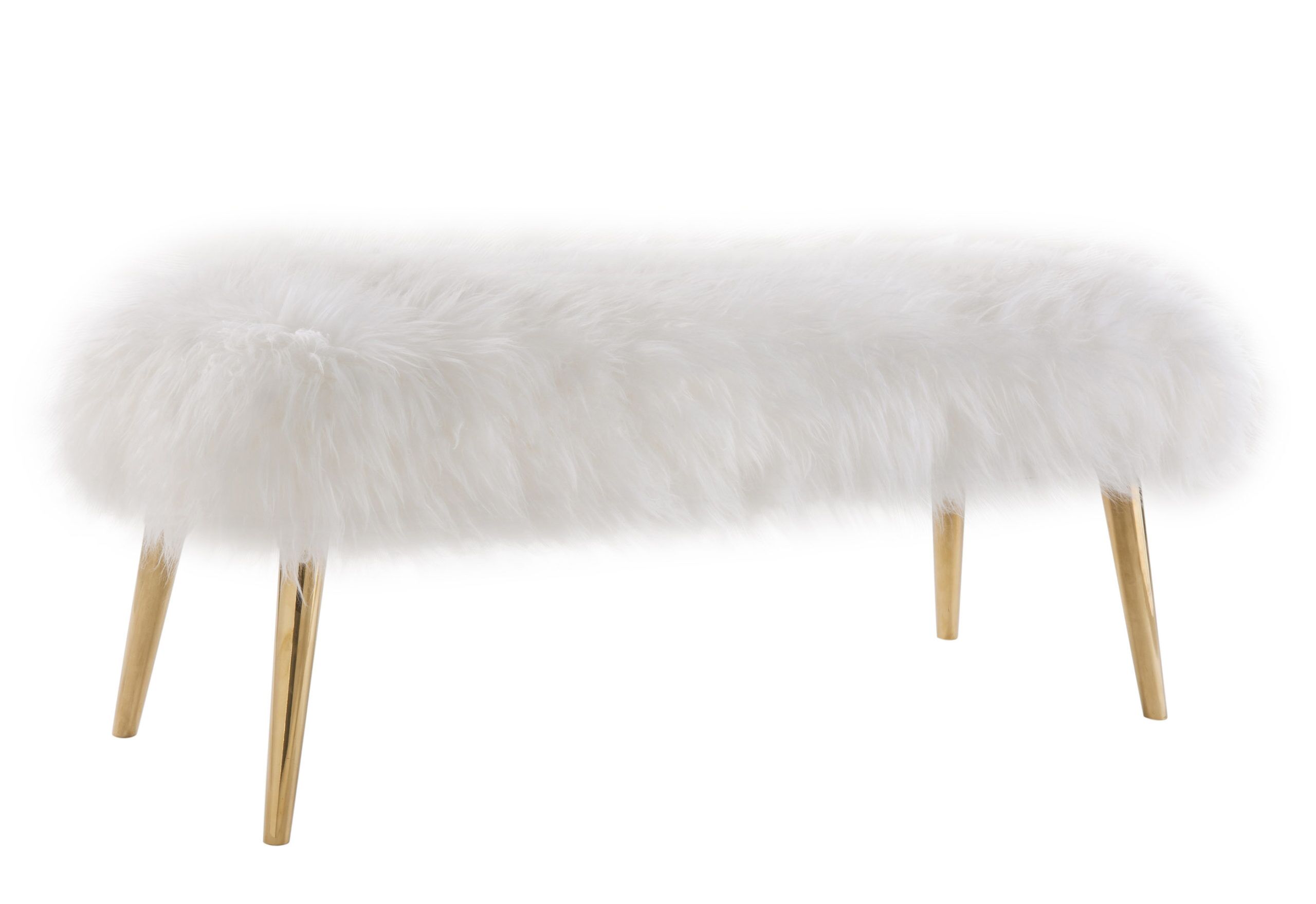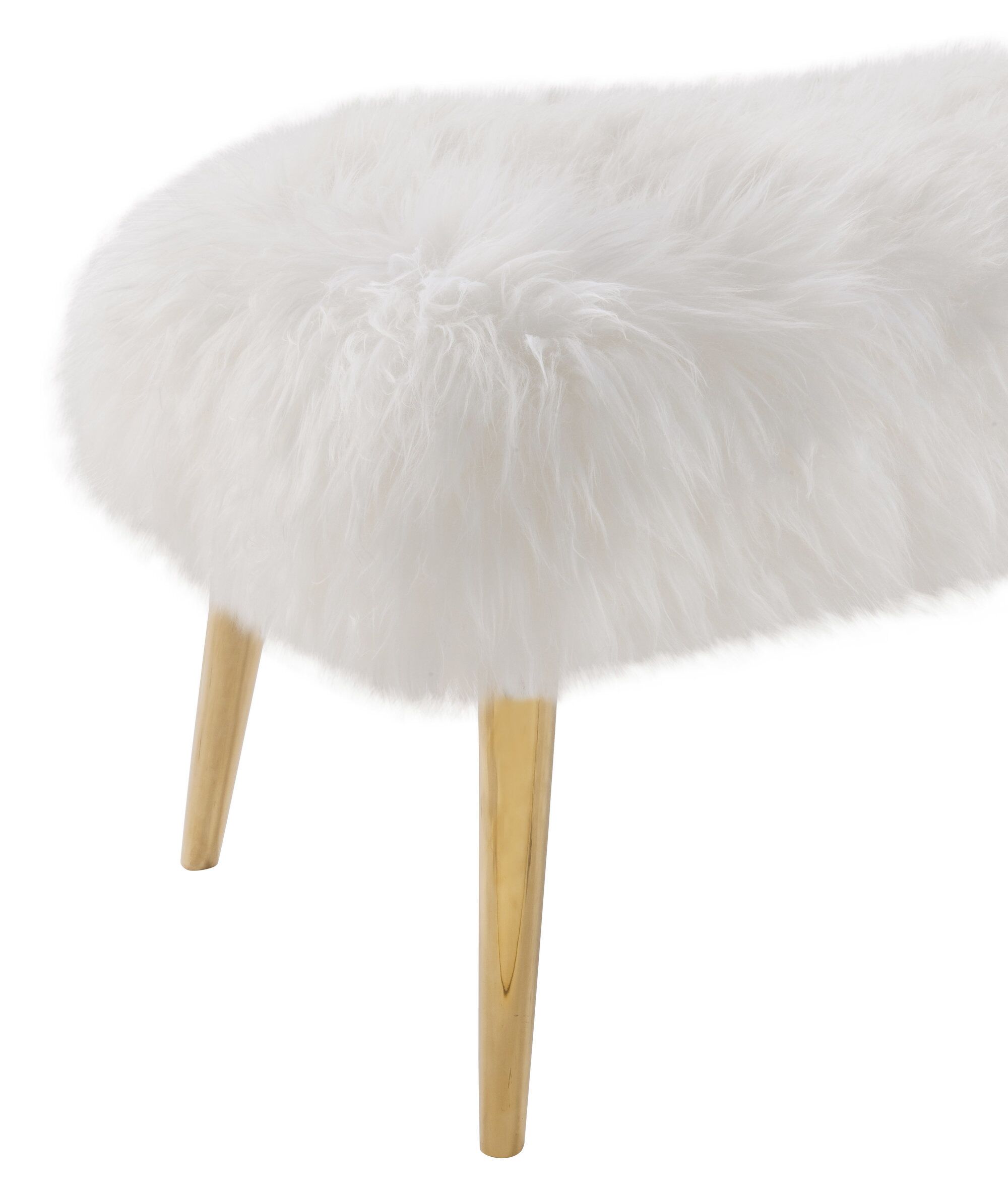 Made with genuine sheepskin, the Churra bench is the perfect chic accessory that is versatile for a variety of uses and spaces. The fabulously fluffy top is perched upon gold stainless steel conical shaped legs.