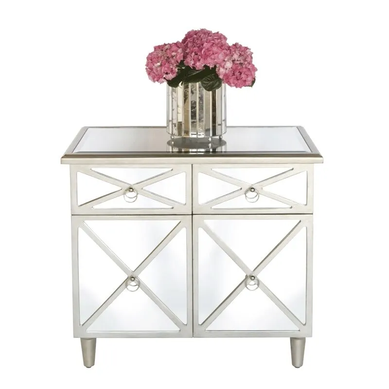 Mirrored crosshatch 2-drawer chest with one interior shelf. Features a painted silver edge and nickel pulls. Color: Mirror & Silver Dimensions: 34″W X 30″H X 20″D