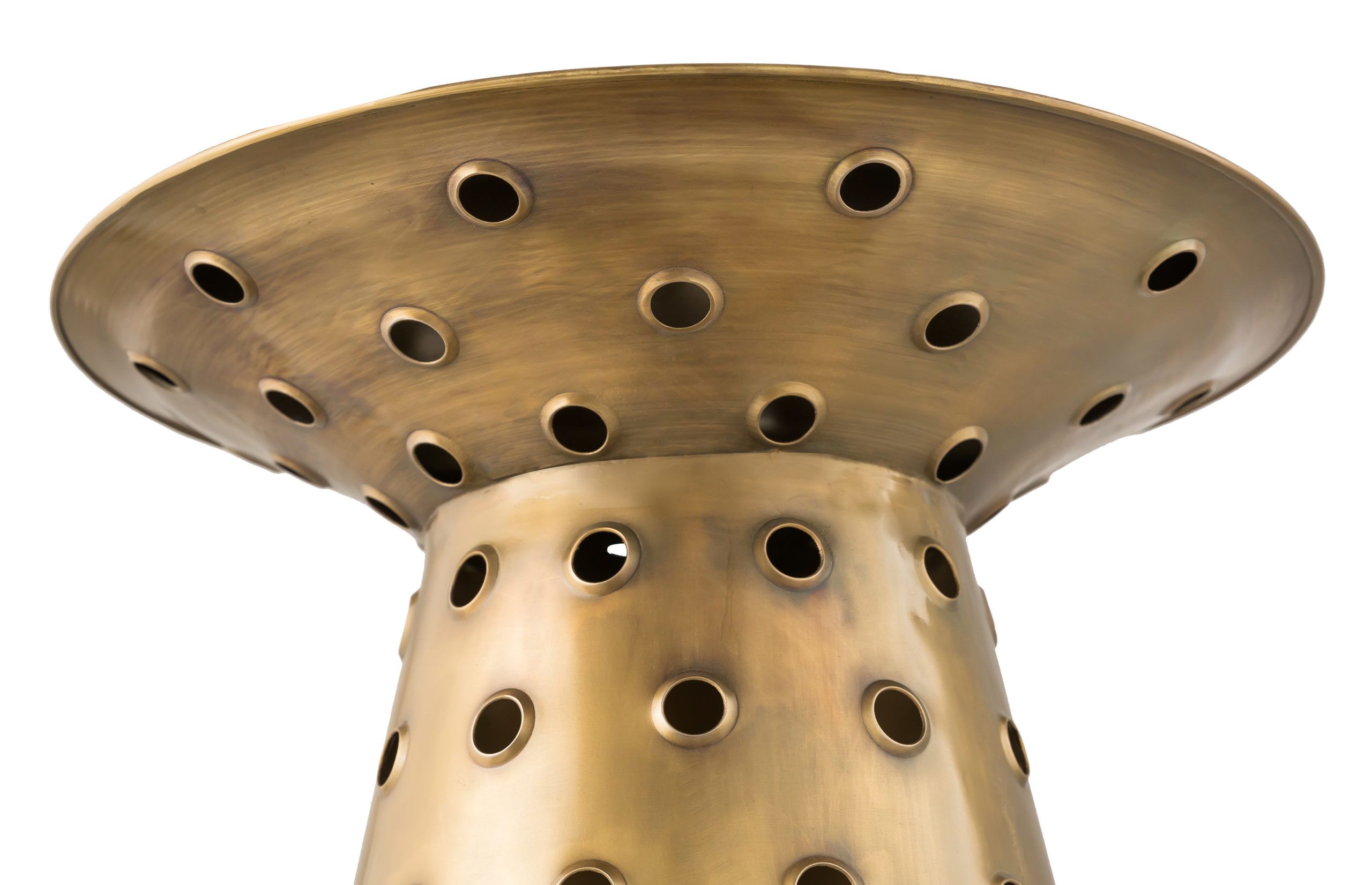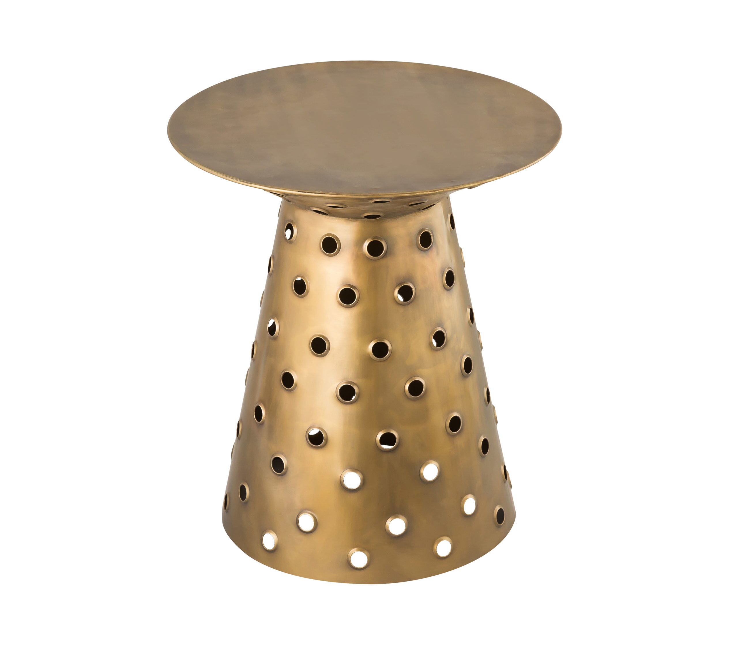 Handcrafted from iron and finished in antique brass, the Collin side table defines industrial chic. Its hourglass shape and decorative design make this occasional table the focal point of your space.