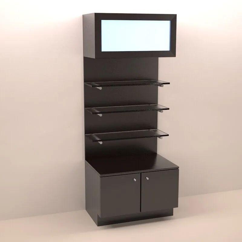 Conveniently display your handbags, hats and jewelry in this modern closet display. Includes adjustable glass shelving with storage below and above. Includes integrated lighting. Custom colors and finishes upon request.