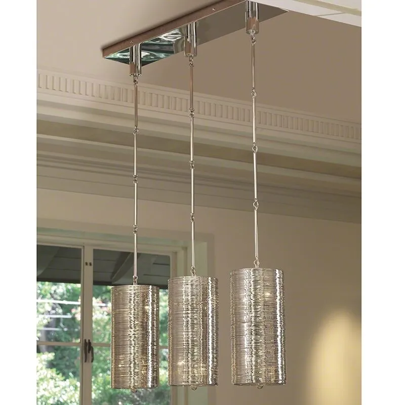 Three tall drum shade made of wrapped nickel finished metal with a white perforated metal diffuserRectangular nickel canopy. Holds six 40W candelabra bulbs, two in each pendant 6′ decorative chain included 36″L x 8″W x 70″H Shade: 7.75″Dia. x 16″H