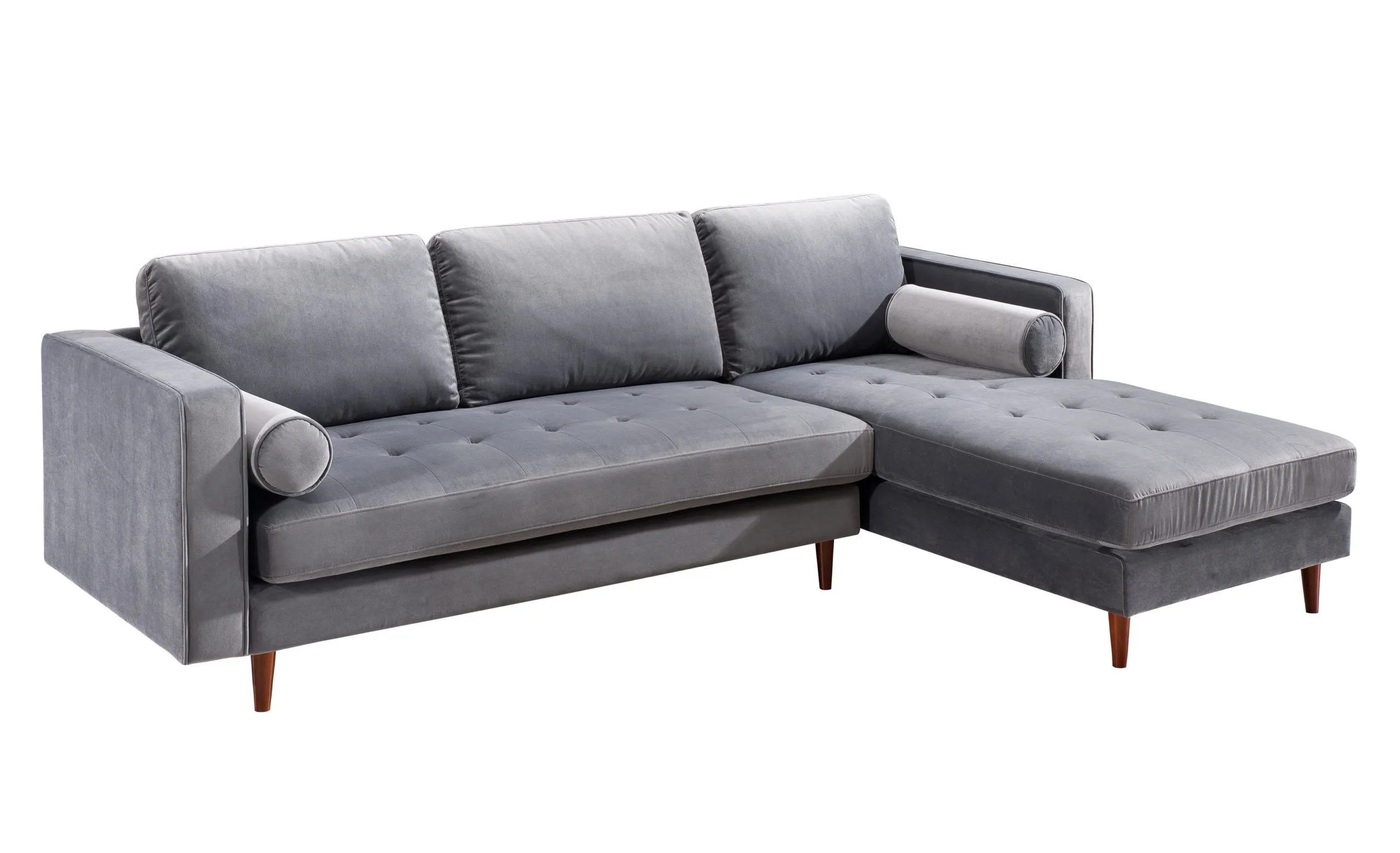 The beautiful mid-century designed Como sectional offers relaxation and style. Featuring removable cushions upholstered in sumptuous velvet, this handsome sectional is available in multiple color options and either RAF or LAF configuration.