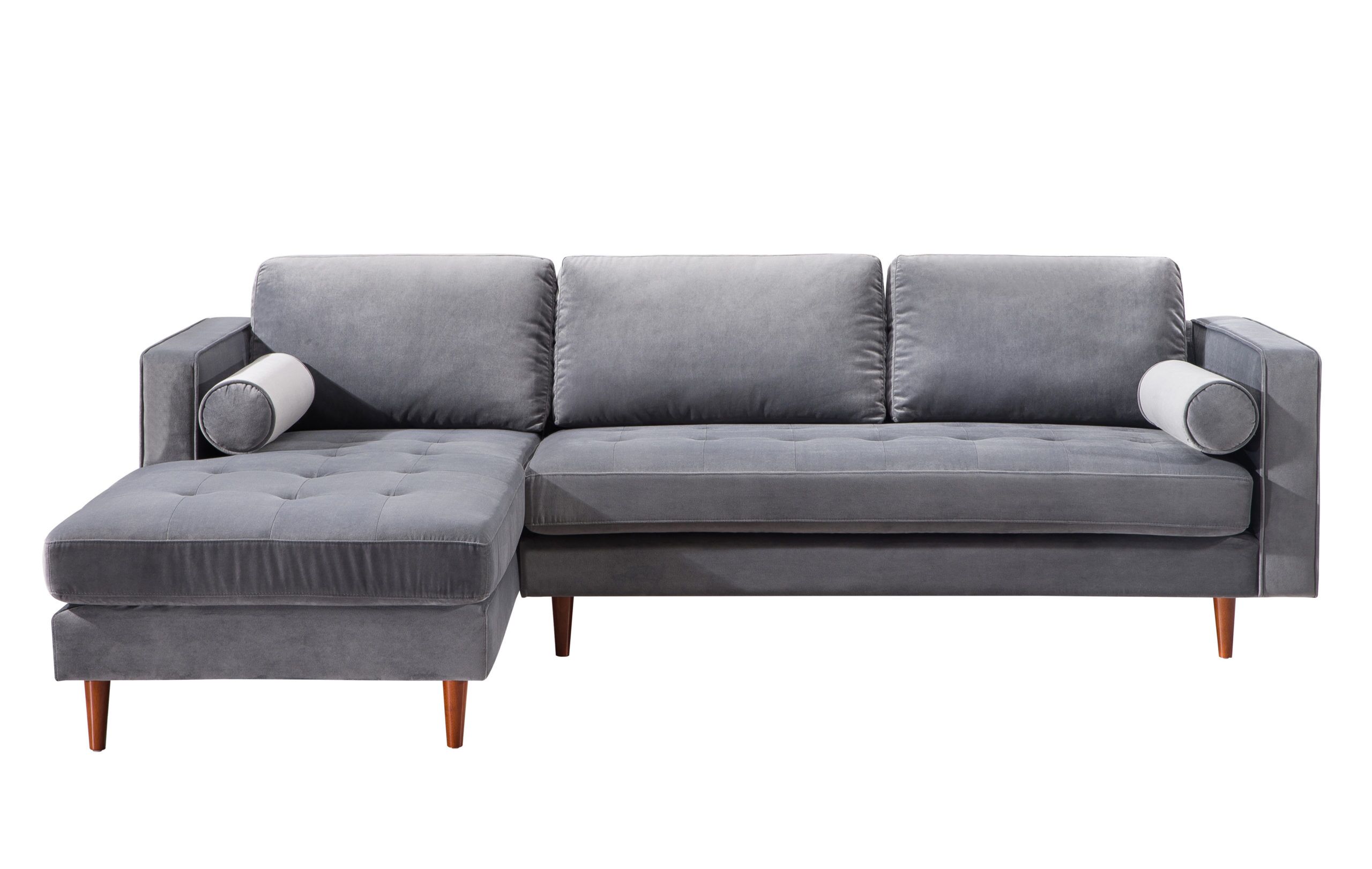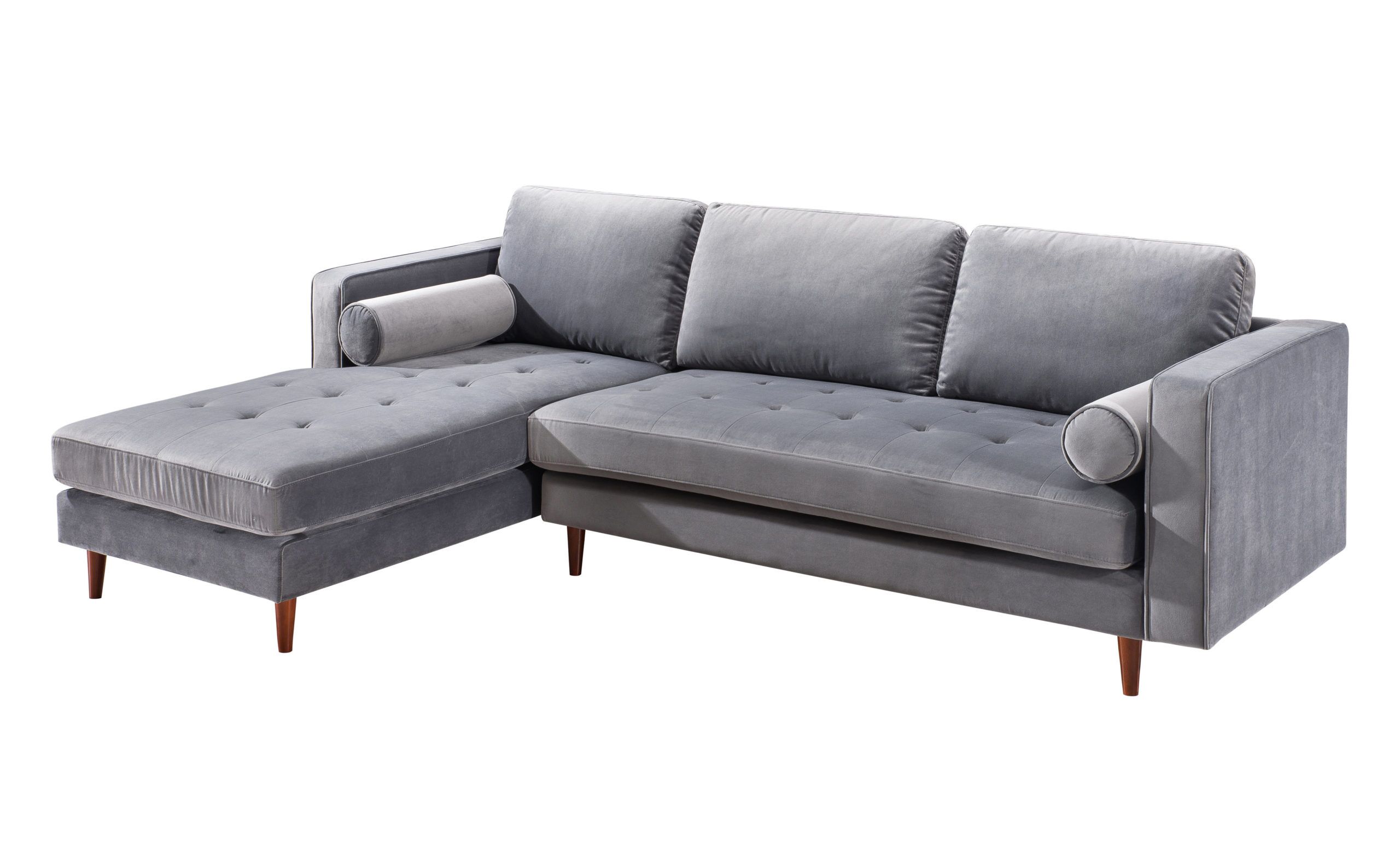 The beautiful mid-century designed Como sectional offers relaxation and style. Featuring removable cushions upholstered in sumptuous velvet, this handsome sectional is available in multiple color options and either RAF or LAF configuration.