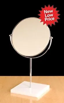 12″ diameter tilting polished chrome mirrors for retail jewelry displays on 9″ x 9″ x 1″ thick white acrylic base. Chrome Finish