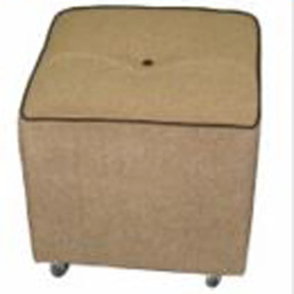 Fully upholstered square stool on clear heavy duty casters with accent piping and button tuft.