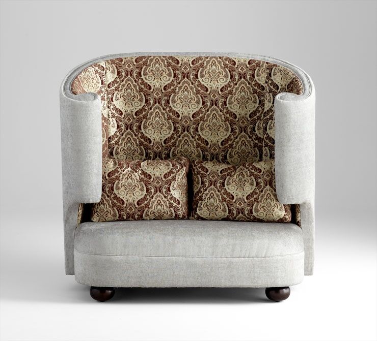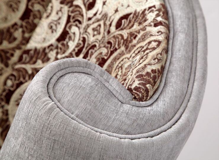 Bold patterned chocolate damask and silver woven chenille come together to create this dramatic loveseat. Dimensions: 61″W x 36″D x 59.5″H