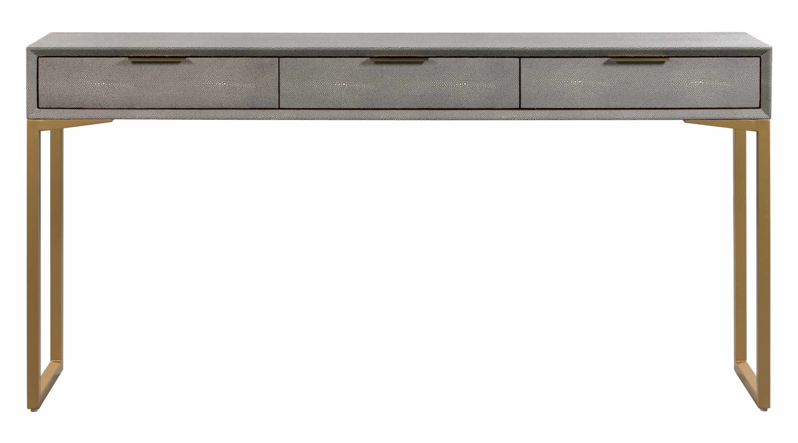 Attention to detail is perfectly displayed with the Debonair Console table. Everything from its textured shagreen finish, dramatic brass legs and handles, to the dovetail drawers finished in cherry wood come together beautifully to provide elegance and contemporary style to your space.