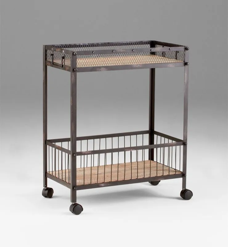 Raw iron and natural wood beverage cart. Conveniently constructed with casters for portability and a basket below for storage. Dimensions: 25.75″W x 14″D x 31.5″H
