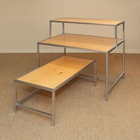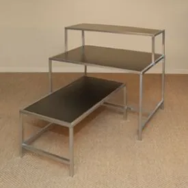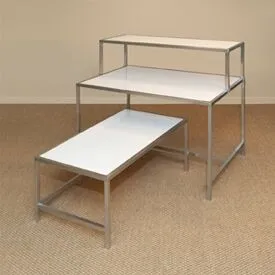 Nesting display tables with brushed chrome frame and laminate top. Laminate top available in black, white or wood. Includes low table 45.5″w x 24″d x 18″h. High table 48″w x 34D” x 29″h. Optional removable top shelf (shown) is 48″w x 18″d x 13″h.