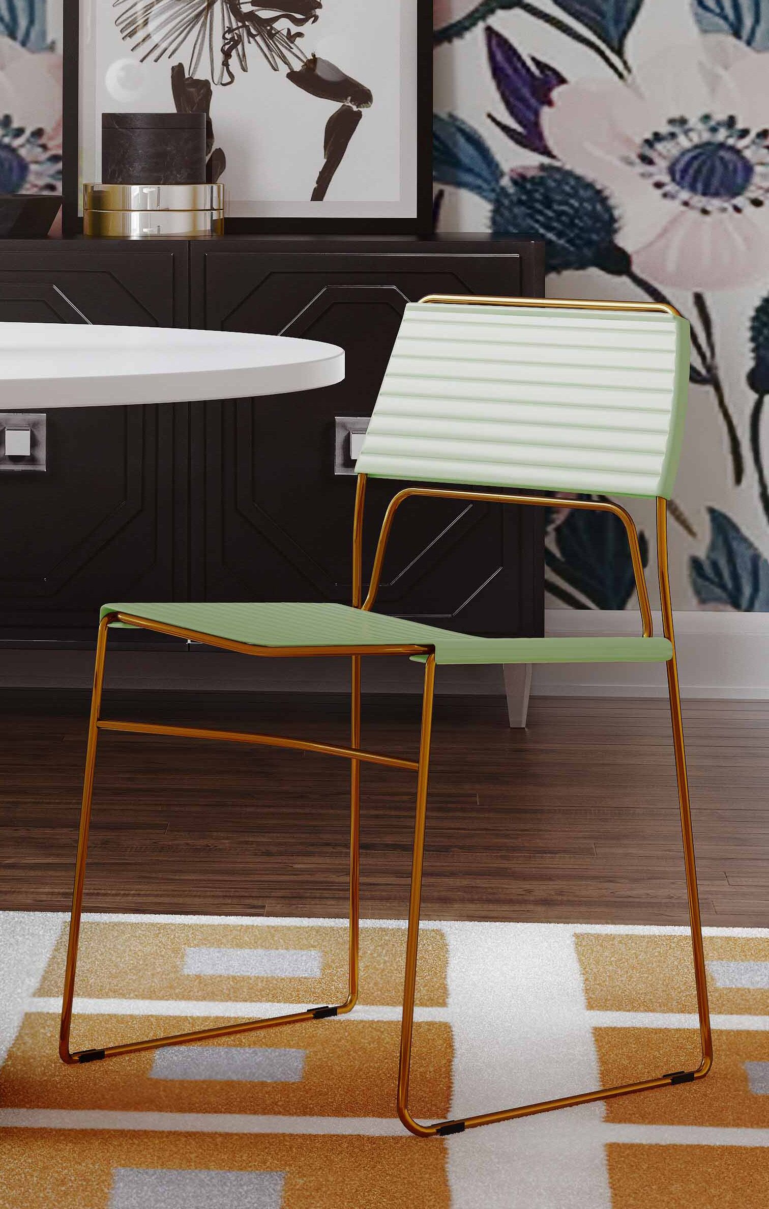 Furnish your space with the attractive and contemporary Domani chair. Boasting durable upholstery available in several soft colors and a polished gold stackable frame, it offers style and utility in one beautiful package.