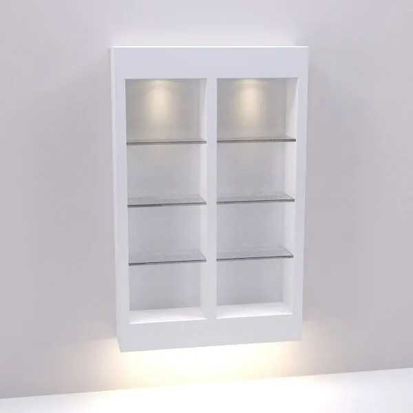 Two-column Modern Retail Display floats on Wall with Integrated LED Lighting to illuminate the inside top and the floor below. Includes adjustable glass shelving. Lead time approximately 6 to 8 weeks. 2-Duplex Outlets to Power Integrated LED lighting. 120v. Custom laminate colors and sizes available.