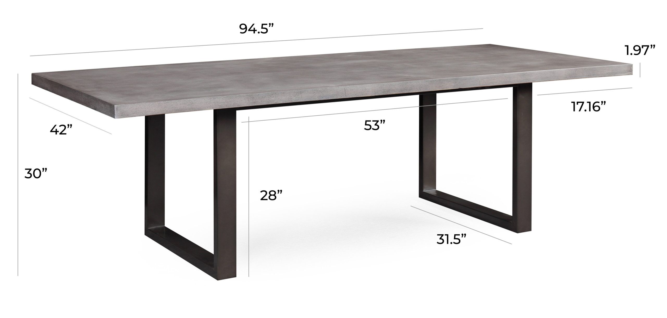 Built on black steel legs, this table delivers exceptional stability and support for everyday use. The generous 94.5-inch width and 42-inch depth provide ample room to comfortably seat six to eight people, making it practical for both family dinners and entertaining guests. The MDF construction with sealed concrete finish offers durability while maintaining the authentic look of solid concrete without the excessive weight. At 30 inches high, it sits at standard dining height for comfortable seating. This one-of-a-kind piece combines industrial materials with refined design to create a functional centerpiece for modern dining rooms.