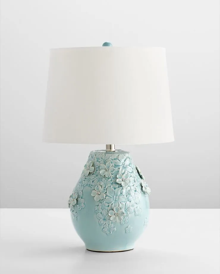 Ceramic / White Fabric Shade / White Lining Sky Blue Glaze Finish Product Dimensions 23.25″(H) x 14.5″(Dia) – (1) 100W M Bulb