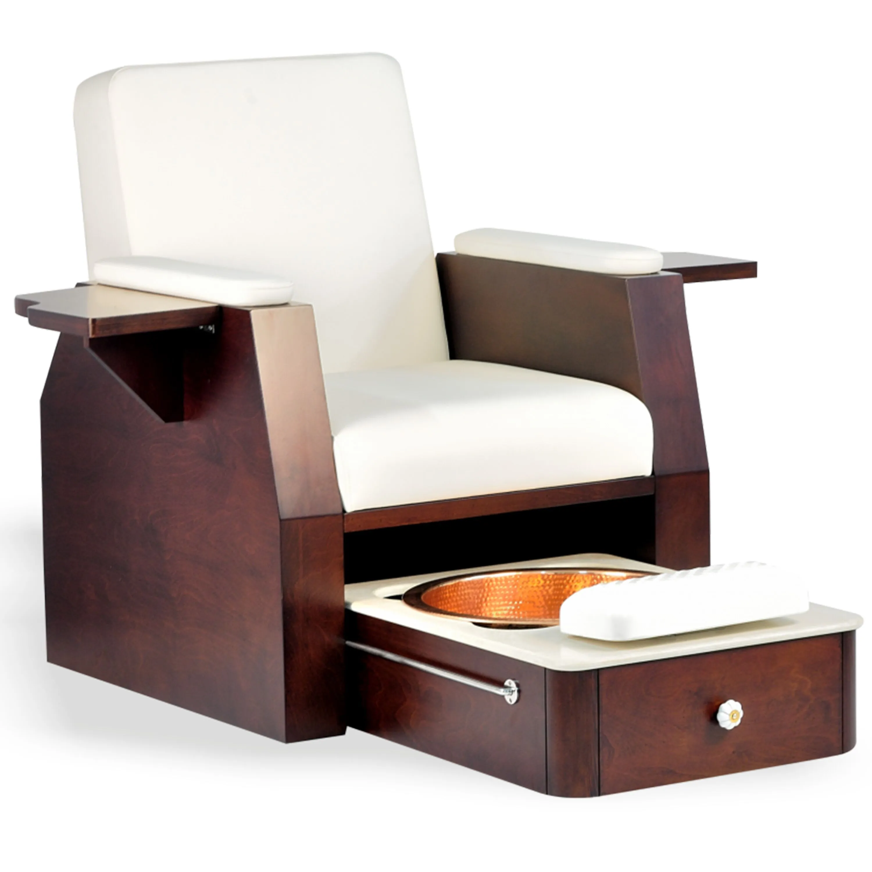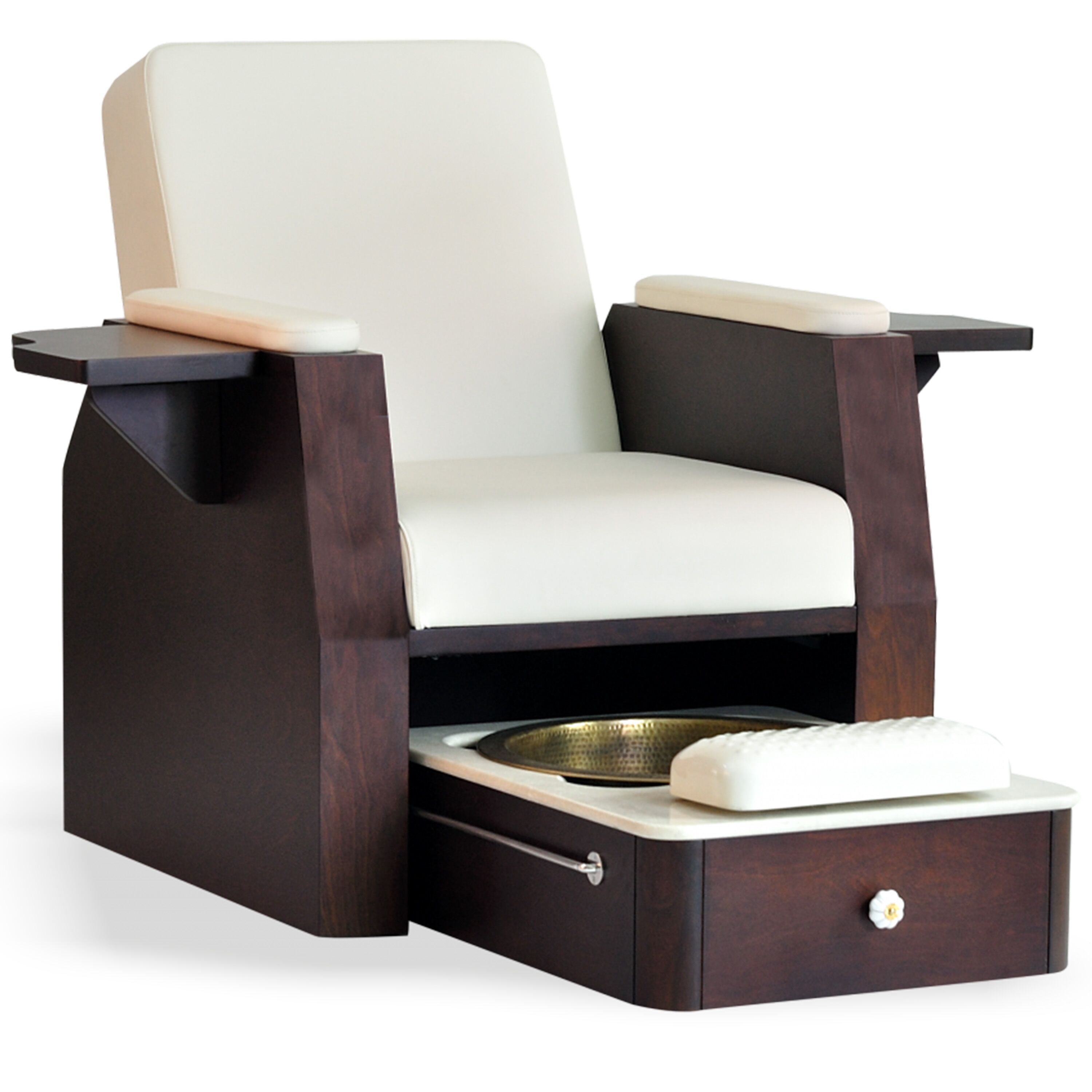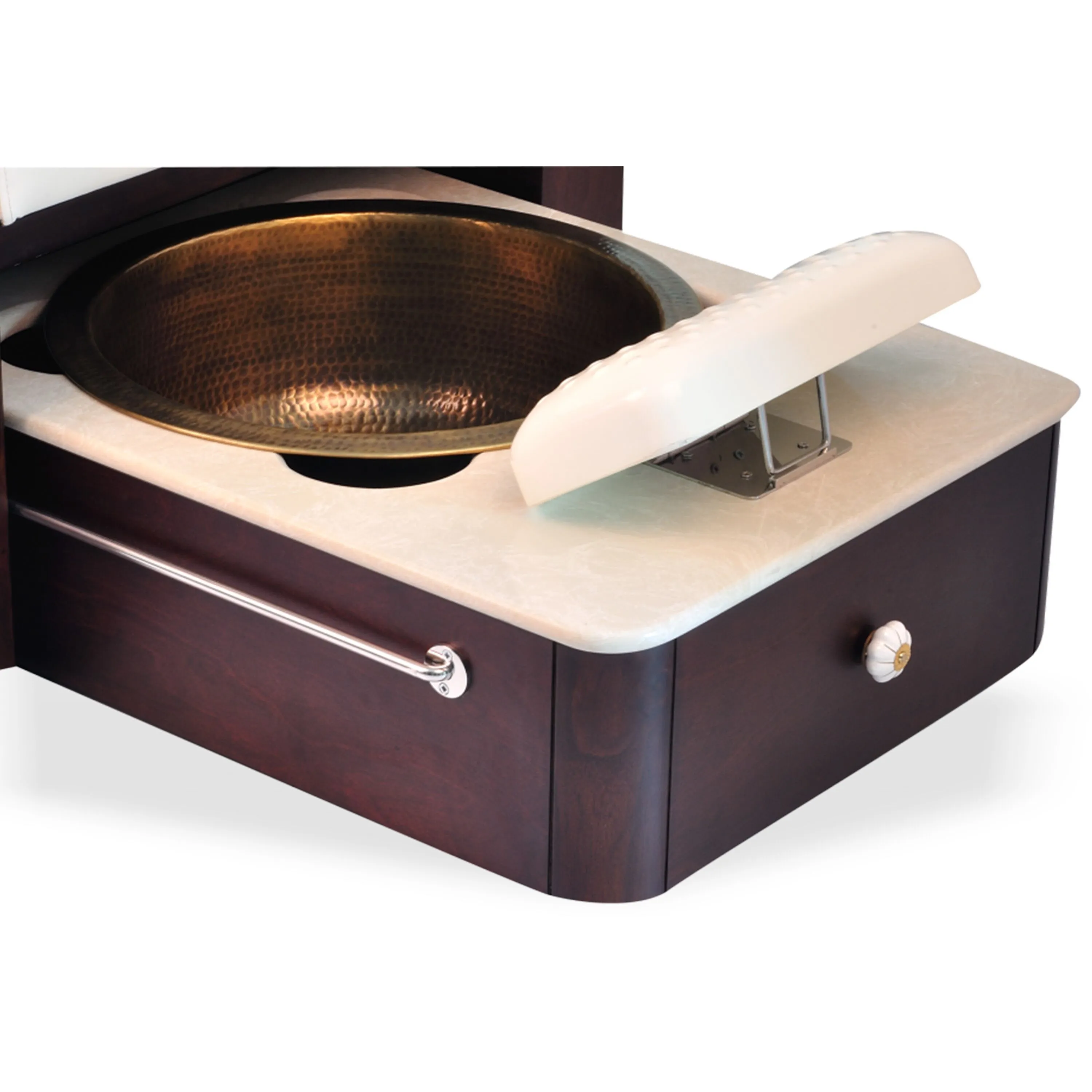 Essie Manicure Pedicure Chair does not require any plumbing connection. It comes with a retractable trolley fitted with large size brass foot wash bowl, a marble top that is easy to clean & waterproof, adjustable foot pedestal in fibre glass for pedicure treatment and foldable armrests on both sides for manicure. Silent castor wheels at the bottom and long stainless steel handle provides easy mobility to the trolley in spa or salon area. The foot wash sink can be yellow brass, copper or antique bronze finish.