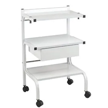 Rolling cart provides extra storage, utility, and work surface. Metal frame with white powder coat finish Glossy white laminate over engineered wood One storage drawer Mag lamp fitting (1/2) UL Listed four-outlet surge protector Assembly required 1-Yr Limited Warranty