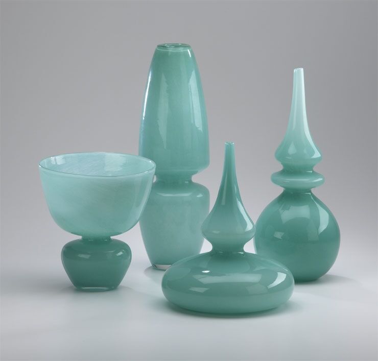 Set of four blown glass vases in turquoise. Small: 7.25″ x 8″H Medium: 4.5″ x 15″H Large: 8.5″ x 11″H Xlarge: 5.25″ x 13.5″H