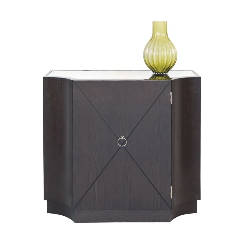 Dark oak veneer one door chest. Inset middle shelf. Inset beveled mirrored top.Color: Dark Oak Veneer with a Mirror Top Dimensions: 34″W X 30.5″H X 18″D