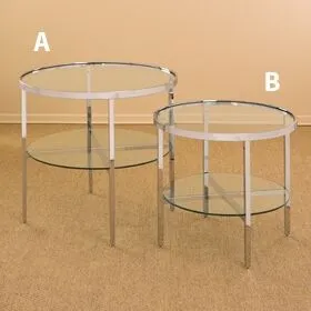 Two-tier chrome and glass adjustable tables. Frames made of 1″ polished chrome tubing includes beveled glass top and shelves. Large table adjusts from 27.5″h to 37.5″h. Small table adjusts from 27.5″ h to 34″. Select 36″ round or 30″ round.