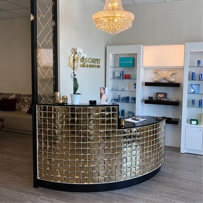 The Glitz Salon Reception Desk delivers immediate visual impact with its polished multi-beveled glass tiles that create a striking multi-dimensional effect. This showpiece serves as your salon’s second first impression, setting the tone for the entire client experience. Designed by Michele Pelafas and made in the USA, this reception desk makes a chic statement that appeals to beauty consumers seeking upscale environments. The sophisticated design features your choice of matte or polished glass tiles, offering refined glamour that works perfectly in stylish salon and spa settings. As the focal point of your reception area, this desk combines functional workspace with eye-catching aesthetics. The multi-beveled glass construction reflects light beautifully, adding depth and dimension to your space. Built for salons that prioritize both form and function, the Glitz Reception Desk creates the wow moment clients expect when entering a professional beauty environment.