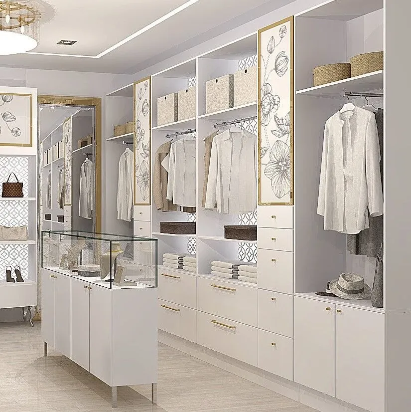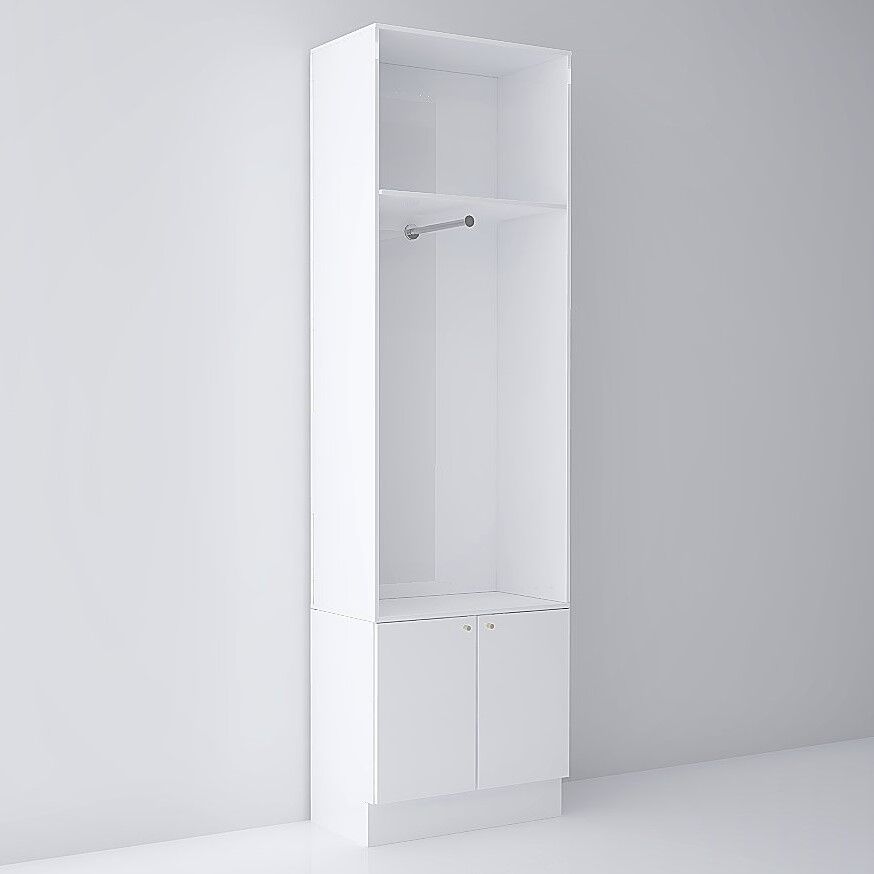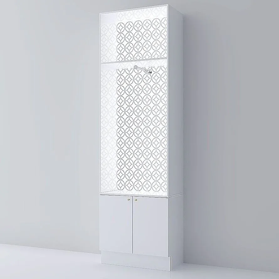 The Gold Edition Front Facing Wardrobe is a modern boutique-style wardrobe for hanging clothes with front-facing style. This wardrobe also contains open storage shelving above with shoe storage below. The open display area is available with a back-lit panel and without. The backlit panel has a geometric pattern for a classic look. The shoe storage has pull out shelves and has enough depth to store shoes 2 to 3 rows deep (depending upon shoe size). The customizable width, offers more shoe storage.
