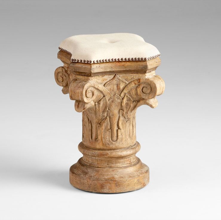 Carved gracewood stool with an aged limed finish and an upholstered seat in linen. Great for vanity & changing areas! Dimensions: 16″dia x 24″H