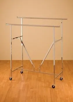 Designed for the outlet store, this rolling clothing display rack can hold the heaviest merchandise, double hanging and when you need casters. K-Brace holds clothing rack absolutely steady. Includes casters. Full 22 wide for suits. Adjusts 81″ high.