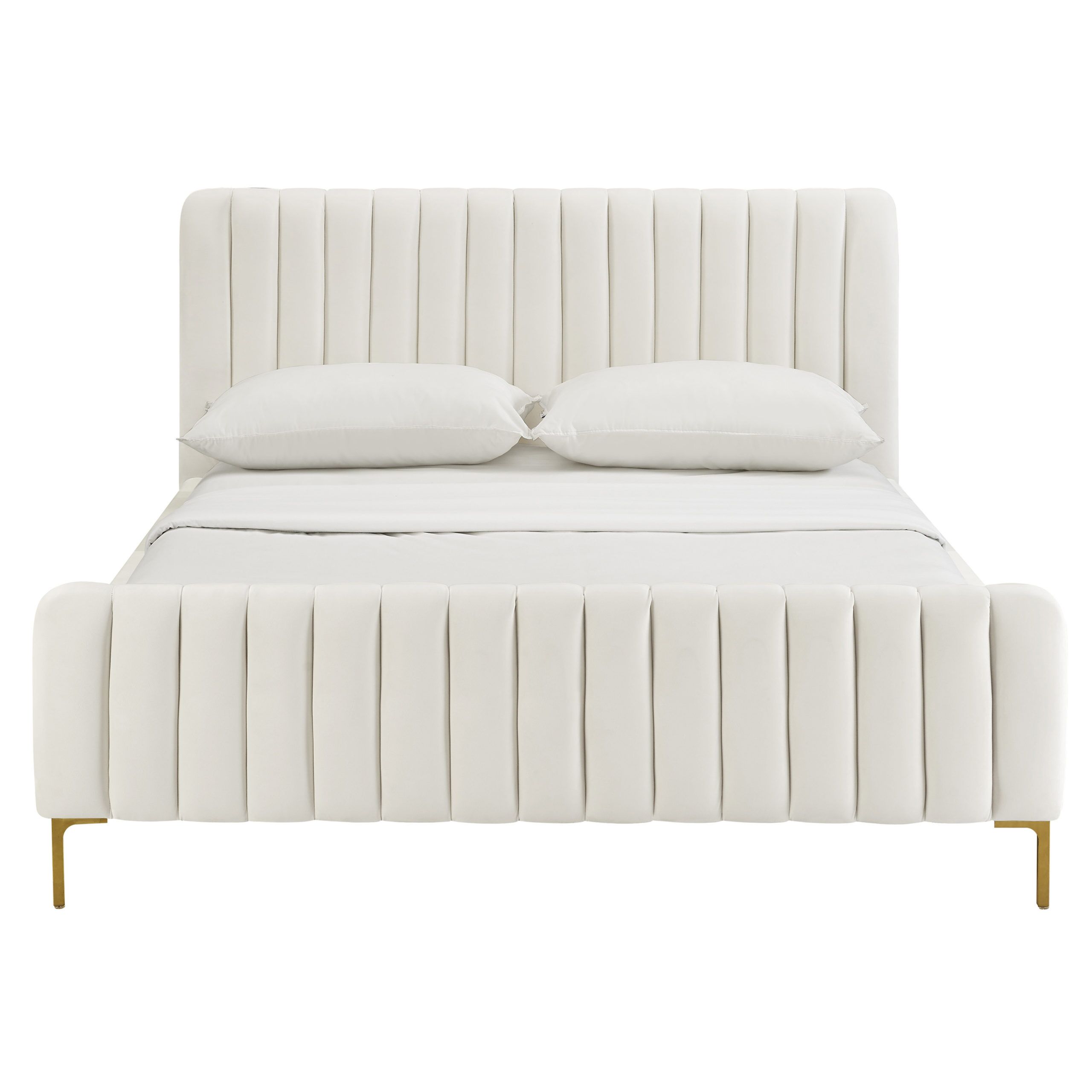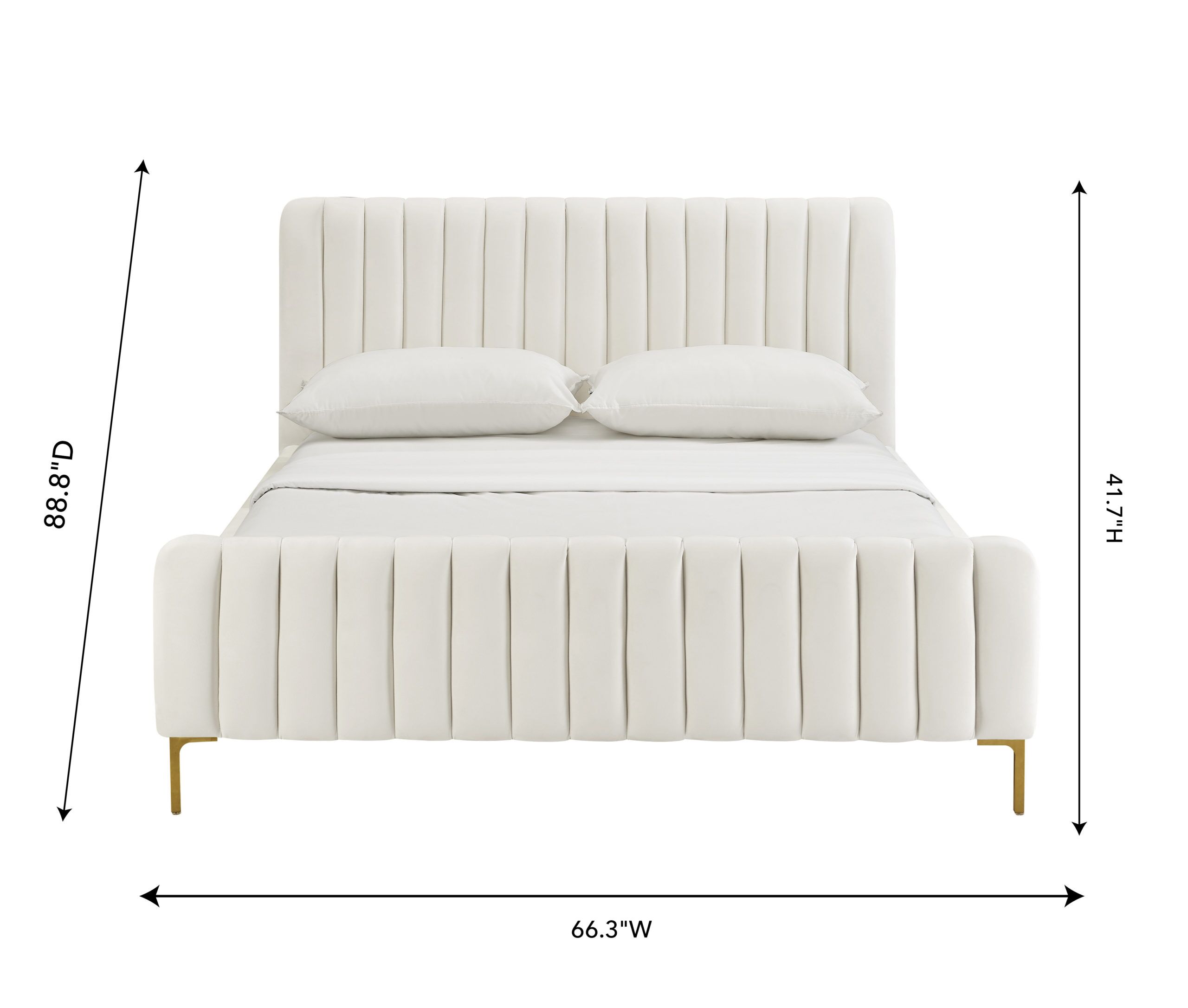 The Angela Cream Bed brings glam design to your bedroom with its distinctive channel tufted upholstery and striking gold legs. Wrapped in sumptuous cream velvet, this handmade piece is crafted by skilled furniture craftsmen using a kiln-dried pine frame for lasting durability. The bed’s thoughtful construction includes integrated slats, eliminating the need for a box spring while supporting up to 1000 pounds. Available in both queen and king sizes, the queen measures 66.3″W x 88.8″D x 41.7″H, making it a substantial focal point for your space. The contrast between the soft cream velvet and metallic gold legs creates a sophisticated look that works well in contemporary or transitional bedrooms. Assembly is required, but the included slats simplify setup. This bed combines practical features with eye-catching style, offering a comfortable foundation for restful sleep without sacrificing visual appeal.
