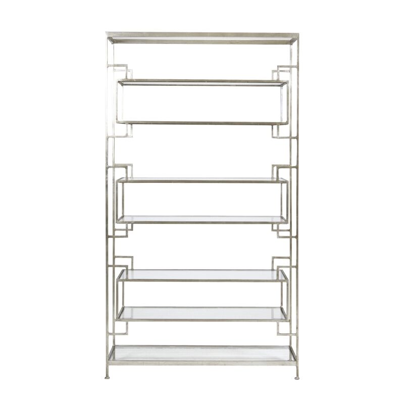 Eight shelf champagne leaf etagere with glass shelves. Top, bottom and inset shelves are 9″ high and two central shelves are 11.5″ high.Dimensions: 40″W X 72″H X 12″D