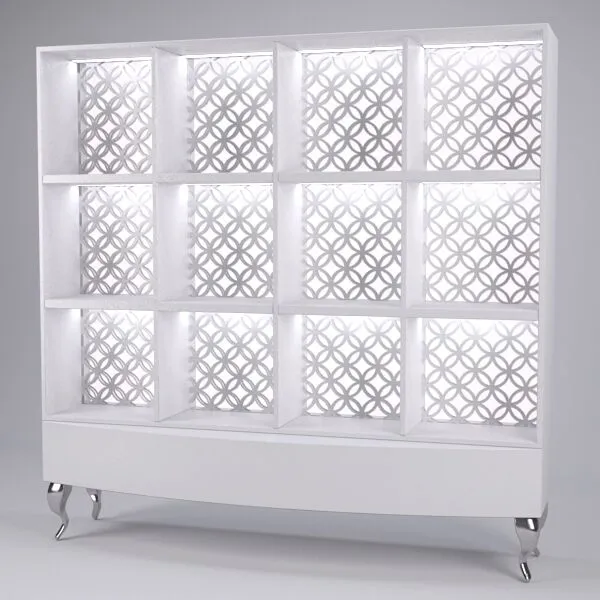 Eye-catching retail display includes back-lit LED acrylic panel with pattern. Sits on curved based with polished chrome legs.