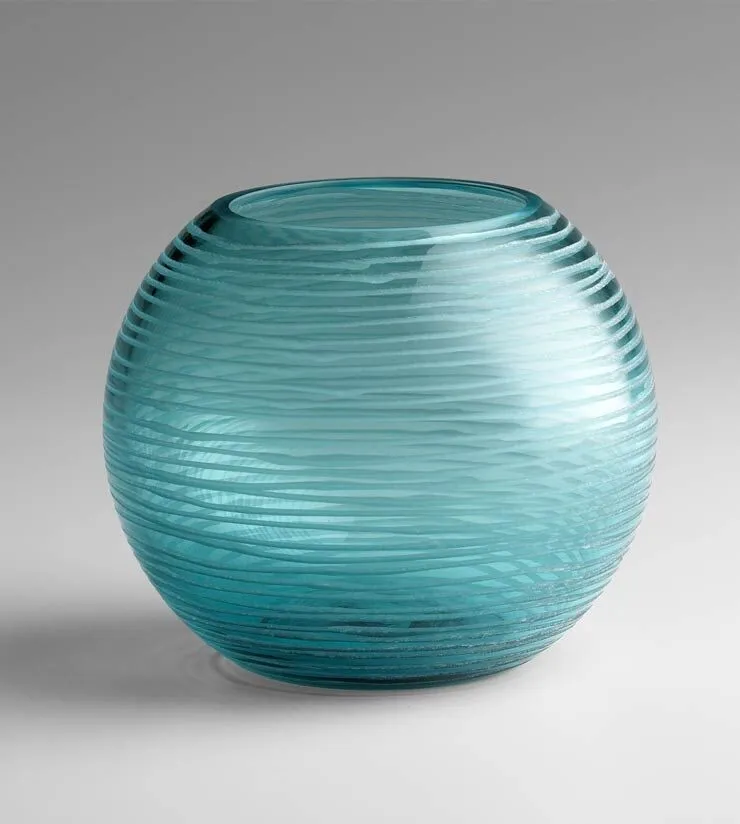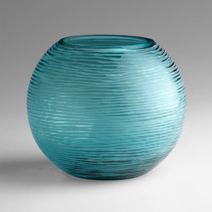 Set of two etched glass vases in deep aqua. Small: 6″ Dia x 5″H Large: 7.75″ Dia x 6.75″H