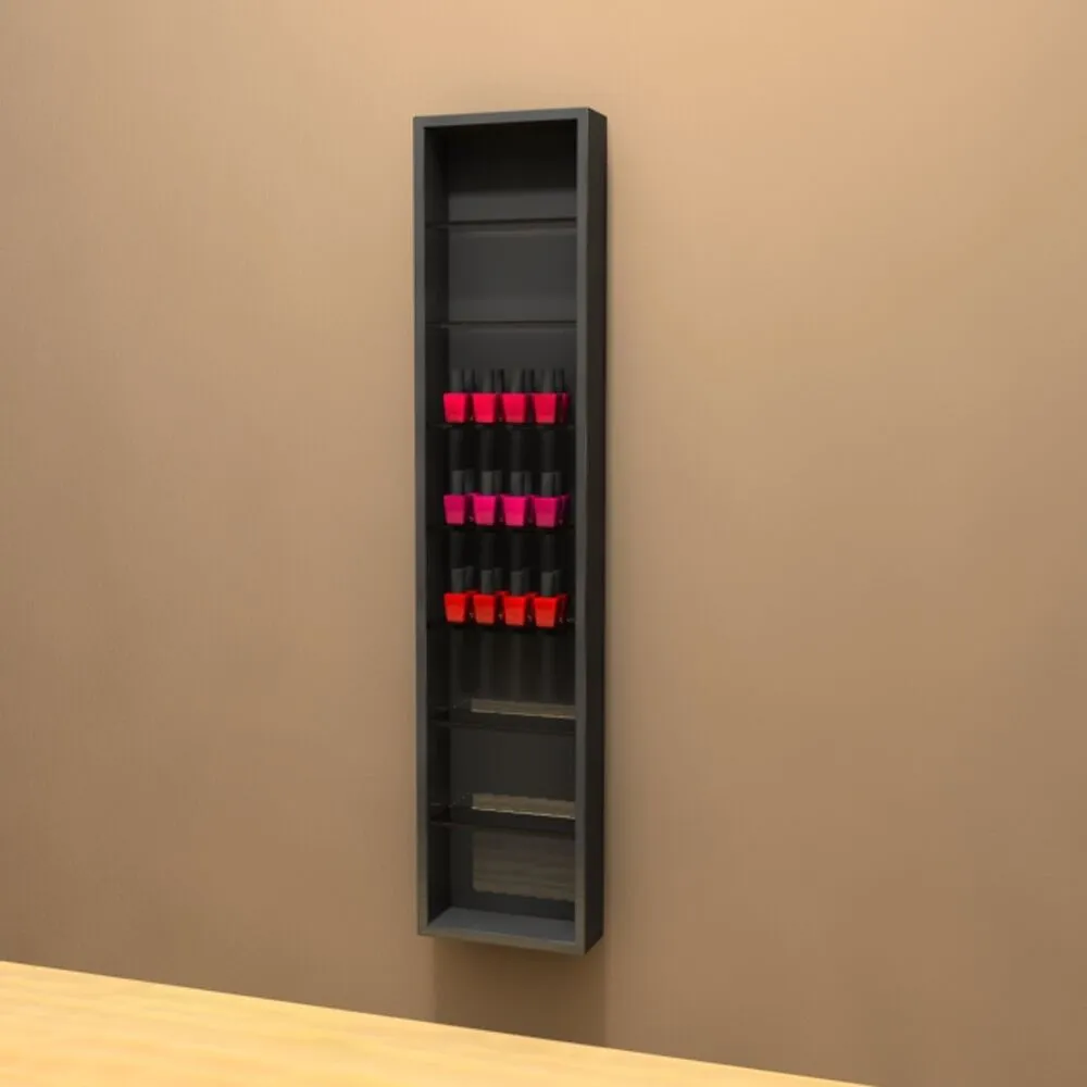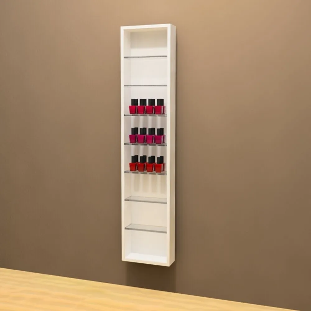 Modern nail polish wall display organizes polishes for maximum effect. Linear Polish Display is made out of laminate with fixed glass shelves. Size 48″h x 18″w x 3″d. Holds up to 36 polishes. Can be recessed in the wall for a clean, finished look. Select your laminate finish.