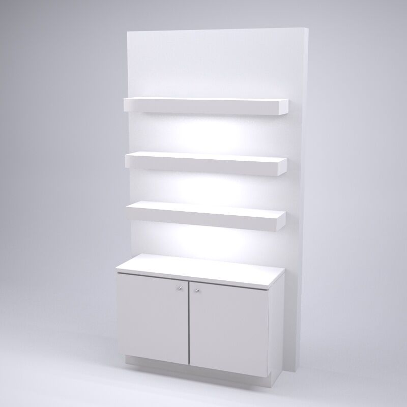 The Lit-Shelf Wall Display with Storage combines functional retail merchandising with integrated LED lighting in a clean, modern design. This 42″w x 78″h x 14″d wall panel features floating retail shelves that create an eye-catching glow effect, perfect for highlighting your products. The unit includes storage below the display area, maximizing your floor space while keeping backup inventory accessible. You can customize both the back panel finish and the finish for shelves and storage to match your store’s aesthetic. Each unit comes with one duplex outlet to power the integrated 120V LED lighting system. The simple yet effective design works well in various retail environments, from boutiques to showrooms. This wall-mounted solution helps create visual interest while maintaining a streamlined appearance. Lead time is 6 to 8 weeks, allowing for quality construction and your selected finish options.