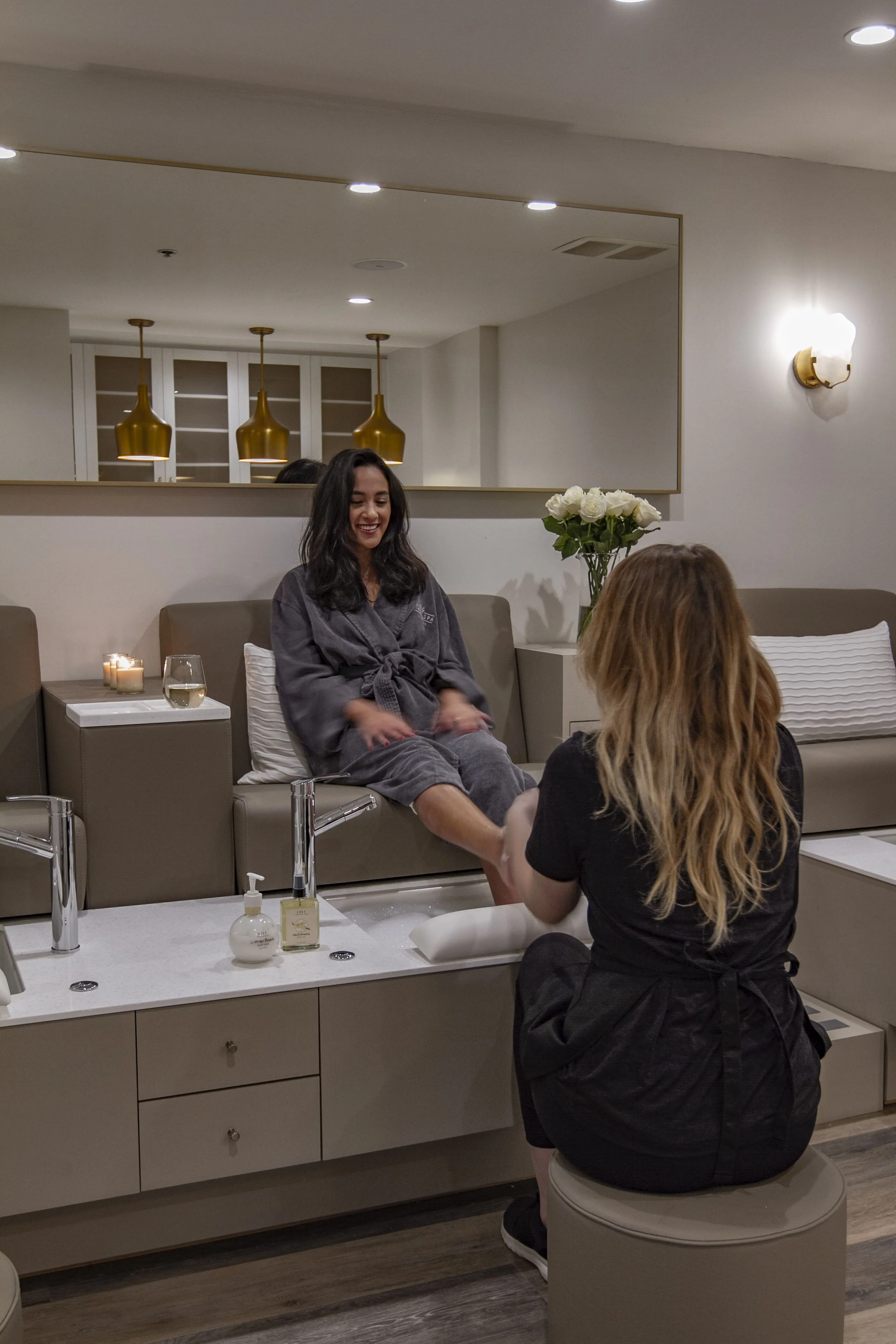 Enjoy modern serenity! Pure clean and extra quiet, the Low Back Pedicure Lounge is comfortable, ergonomic and is characterized by our luxurious rectangular Chroma jet pipe-less reflexology foot bath to stimulate key points on the feet to release tension, restore balance and improve energy flow and wellness. This completely customize-able pedicure lounge is matched with revolutionary hydrotherapy technology to give you the assurance of clean water with every treatment. Pamper your guests with a soothing and relaxing experience in this modern Pedicure Lounge! Optional LED color-changing light for effect. Custom colors and fabrics available.