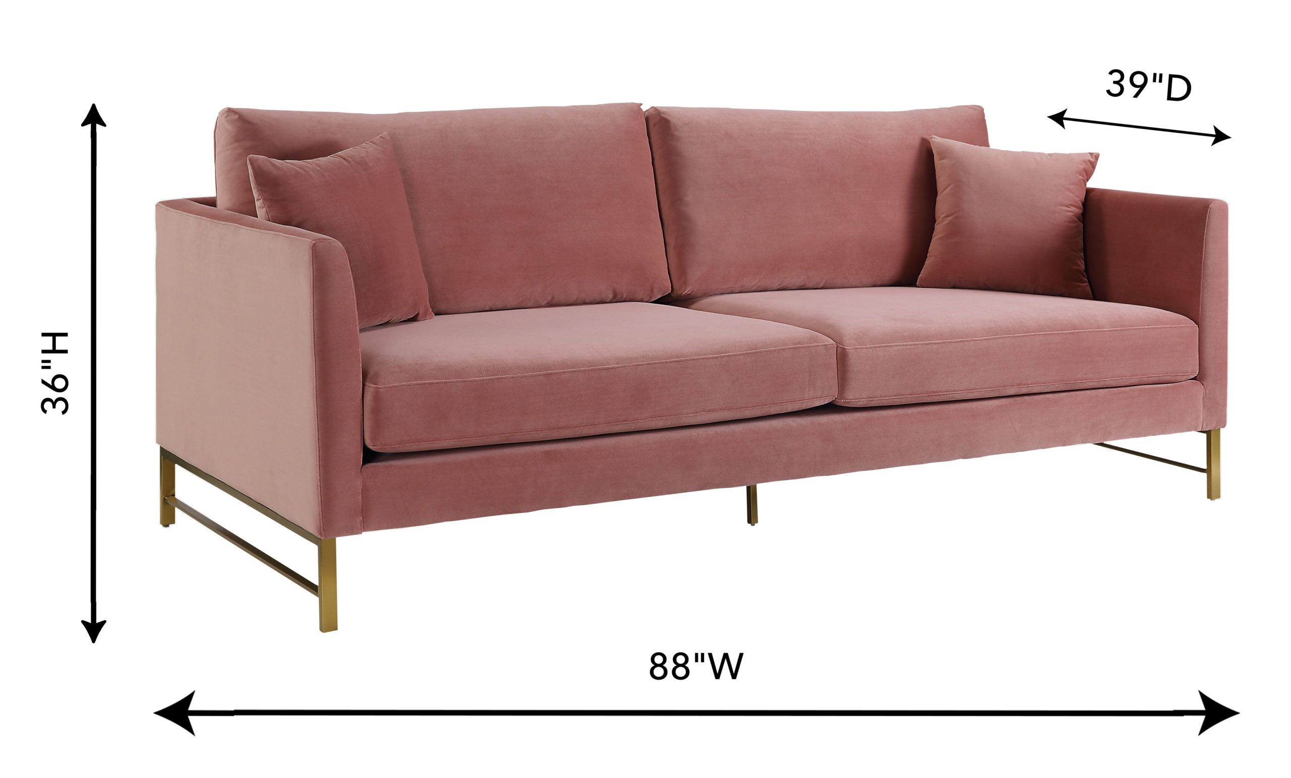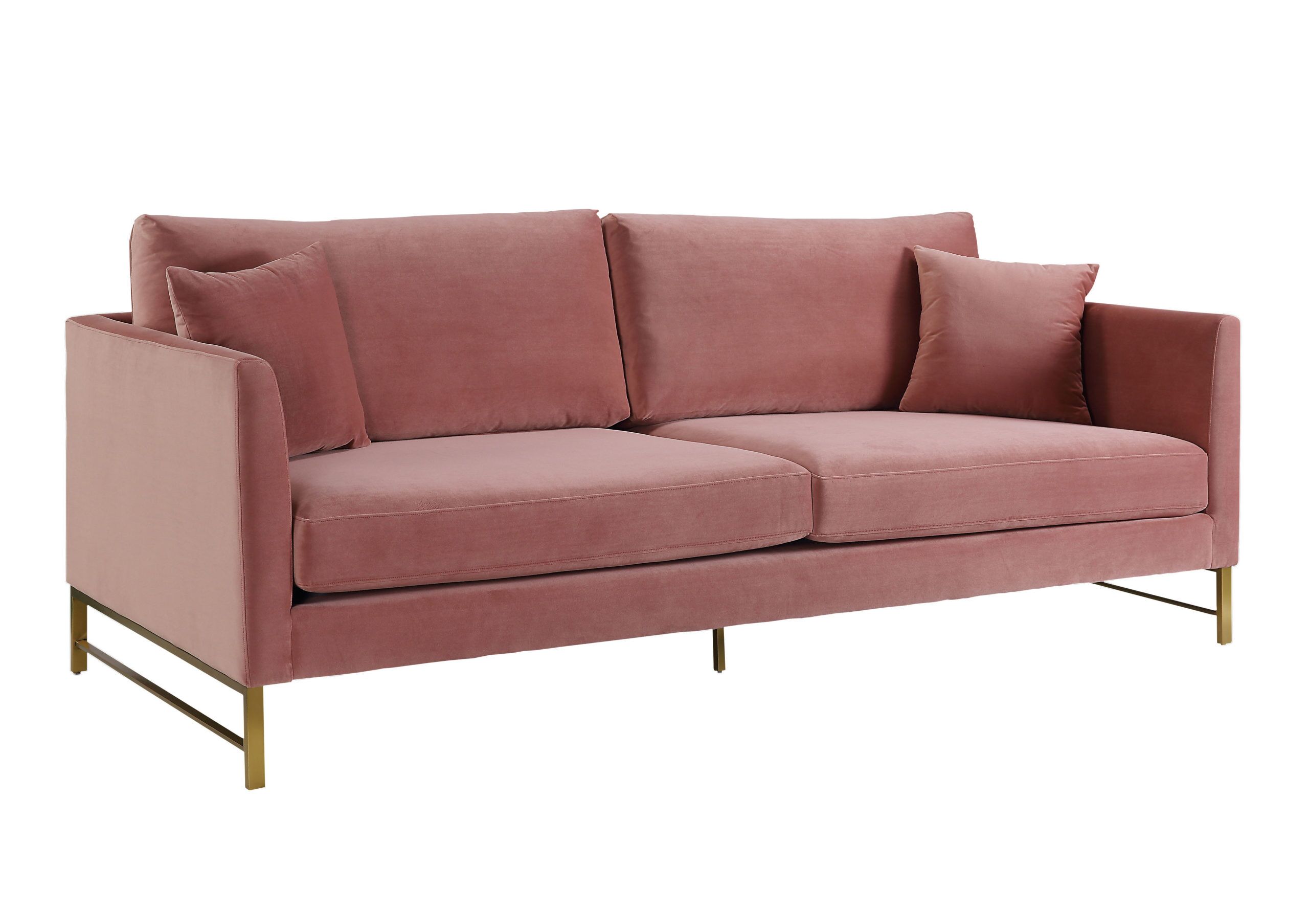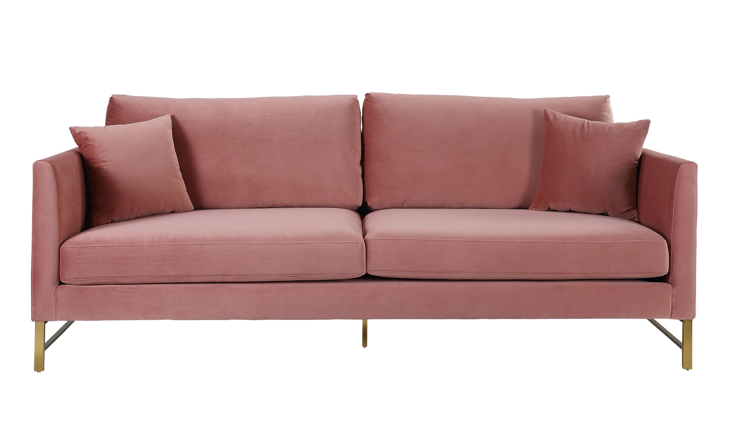 Indulge yourself with the timeless Massi Sofa. Set on gold stainless steel legs, this super comfortable sofa comes in rich grey and rose velvet options. Features removable seat and back cushions as well as two matching throw pillows.