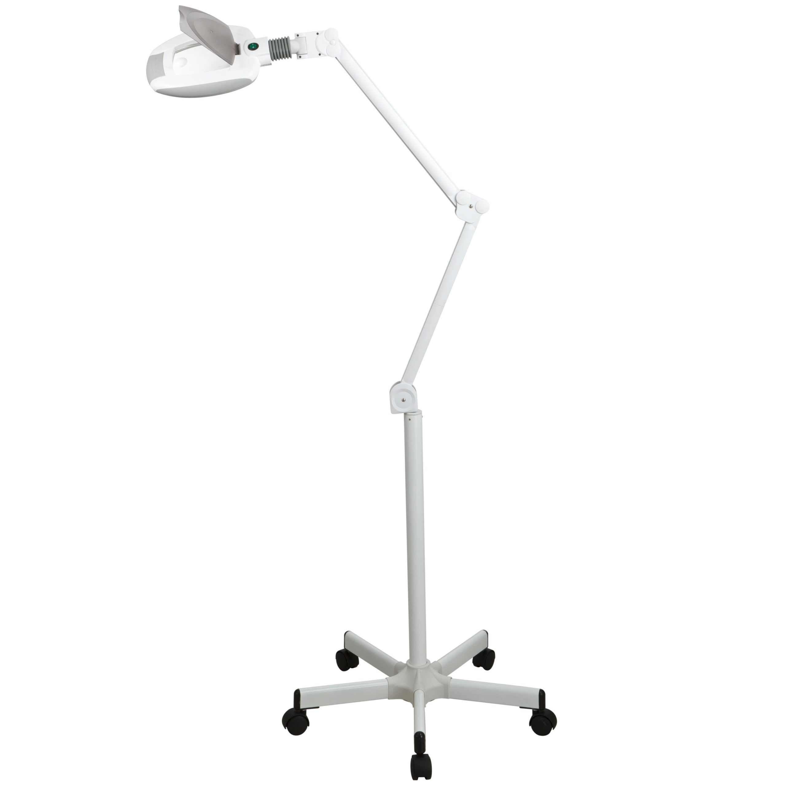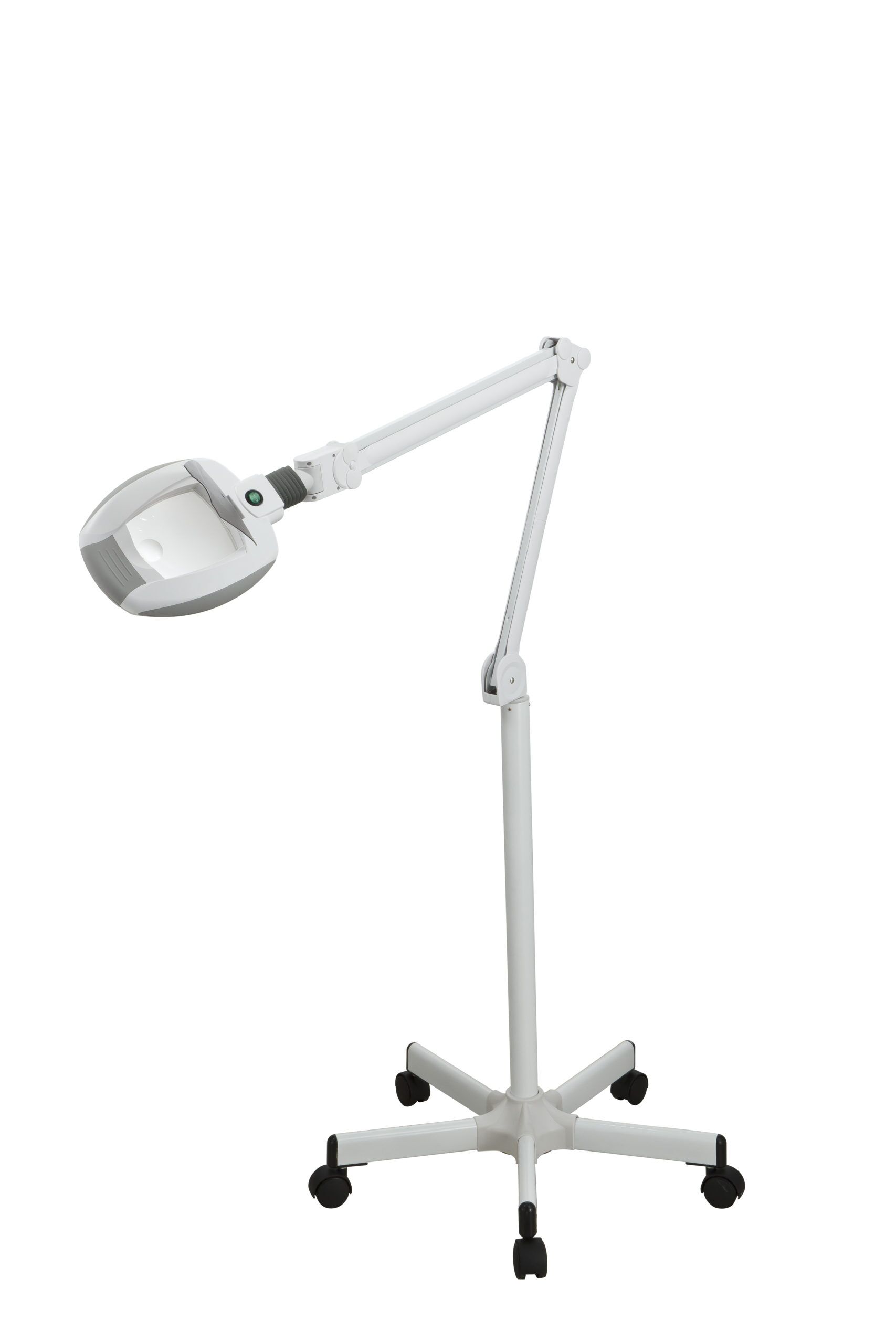3-dioptre LED magnifying lamp of cold light with a 5-dioptre focal spot. The light intensity is adjustable into two fixed positions. It is equipped with an articulated arm and a very stable 5-wheel base. Quality clear lens (no green or blue hue) Protective lens cover enclosed arm with no exposed wires.