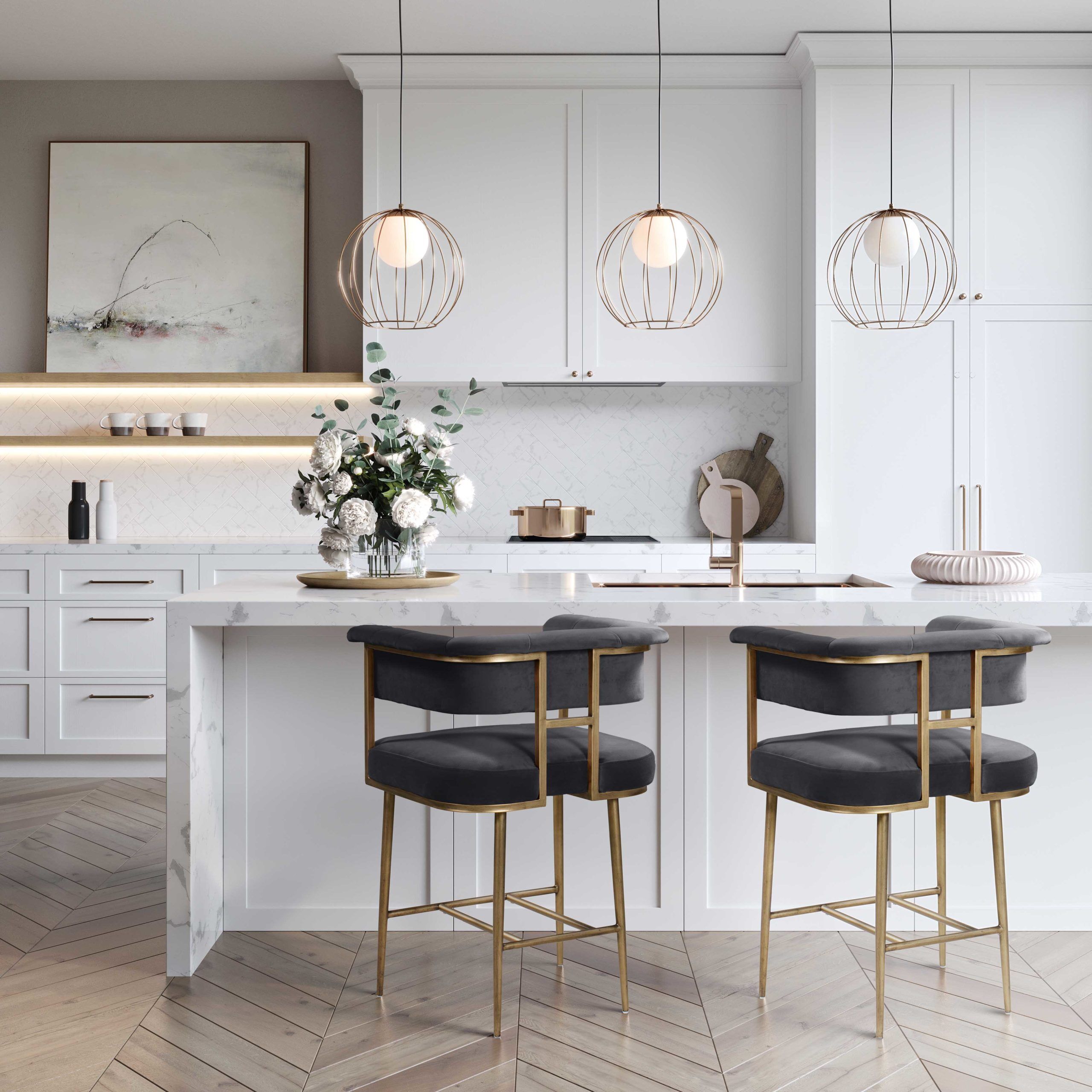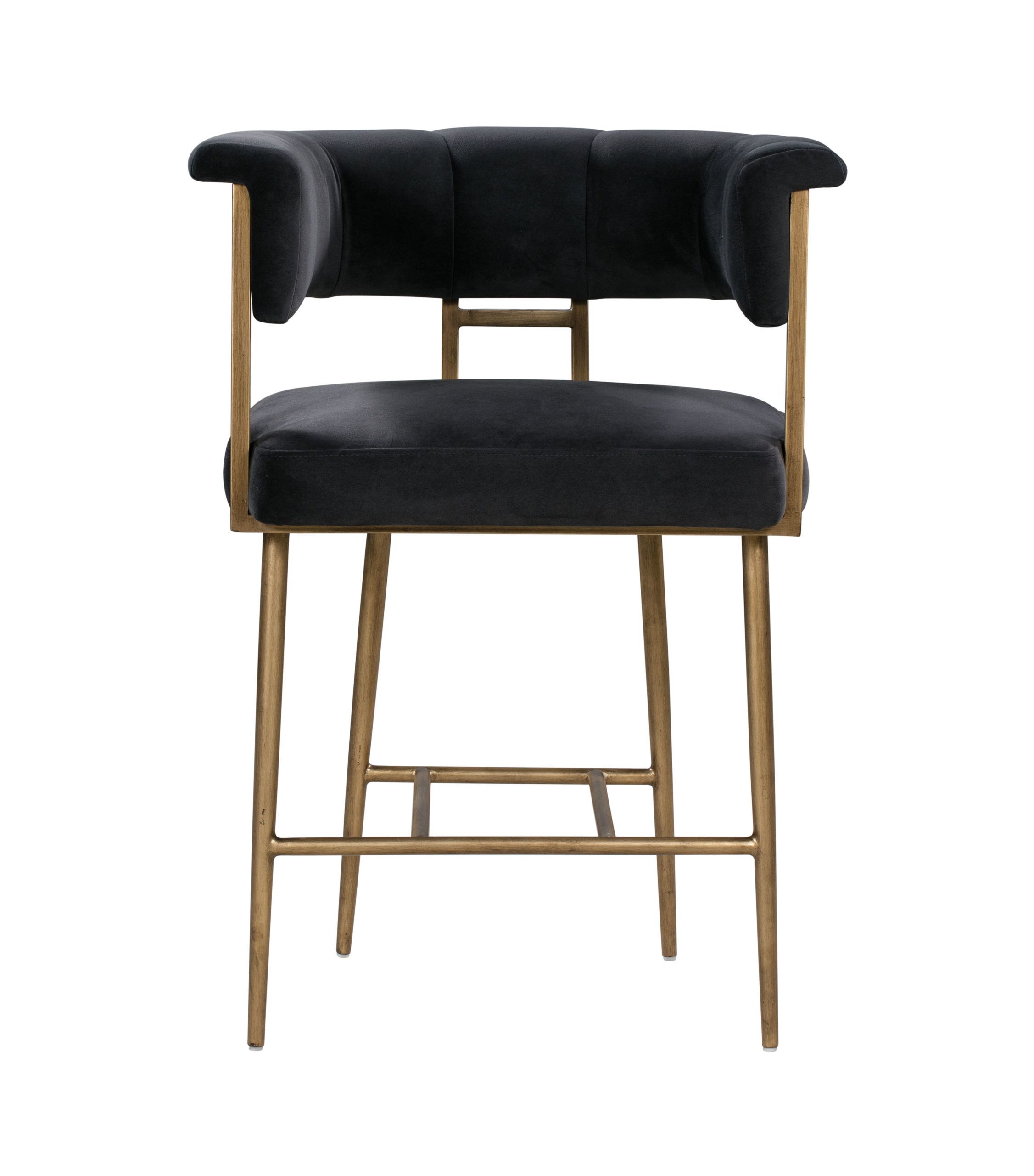 The Astrid collection is sure to elevate the design of your space. Boasting rich upholstery, rolled arms and an exposed frame finished in antique brass. Available in both bar and counter heights.